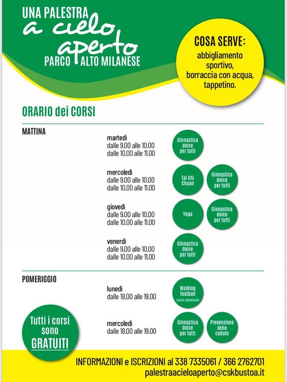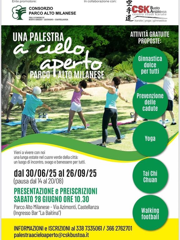 Le attività sono gratuite e accessibili a chiunque, senza distinzioni legate all’età o alle capacità motorie. Per informazioni e iscrizioni: 338.7335061 e 366.2762701, palestraacieloaperto@cskbustoa.it.