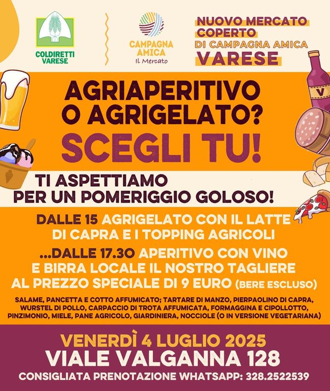 Per i più piccoli l'agrigelato, per i più grandi un tagliere di salumi, formaggi e specialità del territorio: ma gli addendi possono essere tranquillamente invertiti nel pomeriggio goloso che Coldiretti Varese e Campagna Amica mettono in agenda per venerdì prossimo, 4 luglio. "Agrigelato o Agriaperitivo? Scegli tu!" è dunque il tema dell'iniziativa in programma nel pomeriggio di venerdì prossimo, 4 luglio 2025, presso il mercato coperto di Campagna Amica in Viale Valganna 128, nella città capoluogo. L'evento offre ai visitatori la possibilità di gustare le eccellenze agroalimentari locali in due contigui momenti conviviali.