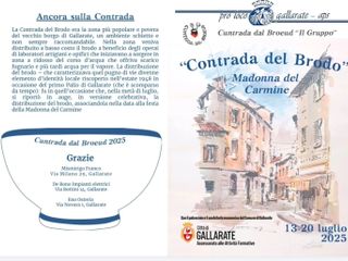 «Siamo felici di riproporre questo appuntamento della tradizione gallaratese che davvero è molto sentito soprattutto dai contradaioli – dichiara Vittorio Pizzolato, presidente della Pro Loco di Gallarate –. La festa della Contrada del Brodo è davvero un momento molto sentito per la comunità della Contrada. Giorni di raccoglimento con i rosari nei cortili, la santa Messa e la processione con il simulacro della Madonna del Carmine. È come se il tempo si fermasse e fossimo trasportati con la mente alla contrada che fu, quella del passato in cui la commistione fra sacro e profano era il motore della festa. Siamo tutti invitati domenica mattina al momento clou con la distribuzione del brodo benedetto all’angolo di via San Giovanni Bosco».