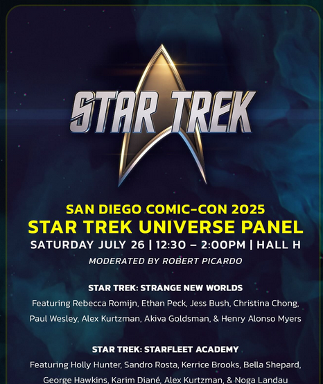 Sul palco del panel c’erano Ethan Peck, Rebecca Romijn, Jess Bush, Paul Wesley e Christina Chong. Assente Anson Mount, diventato da poco papà. Proprio Goldsman ha rivelato che la prossima stagione di “Strange New Worlds”, la quinta, sarà anche l’ultima. Ma pare abbia in serbo un possibile sequel: una nuova serie intitolata, “Star Trek: Year One”, ambientata poco dopo l’arrivo del capitano Kirk al comando dell’Enterprise.