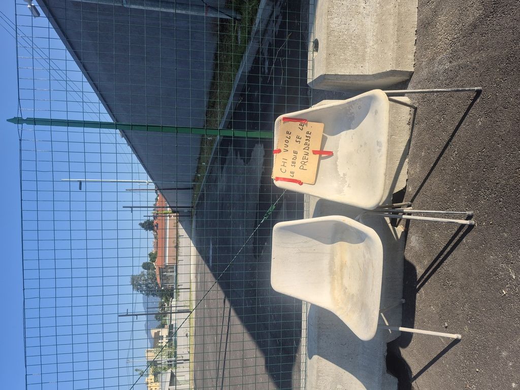 Ore otto del mattino di un giorno da cani(cola), piazzale Kennedy, in fondo, a ridosso della rimessa dei pullman. Sto per arrivare a casa dopo la consueta pedalata quotidiana, stavolta breve per via del maledetto cammello africano che picchierà fino a 35 gradi nel “dopodisnà”. Passo sotto il ponte della ferrovia, curvo, e un fotogramma di “Cinico tv” mi colpisce la vista. Il “punctum”, come direbbe Roland Barthes, è lo straordinario nastro isolante rosso fuoco, che attira immediatamente l’attenzione, prima ancora delle due sconsolate sedie anni ‘90 un tempo bianche e dello straordinario messaggio scritto a pennarello: «Chi vuole le sedie se le prendesse.» Punto. Più che un invito, un diktat.