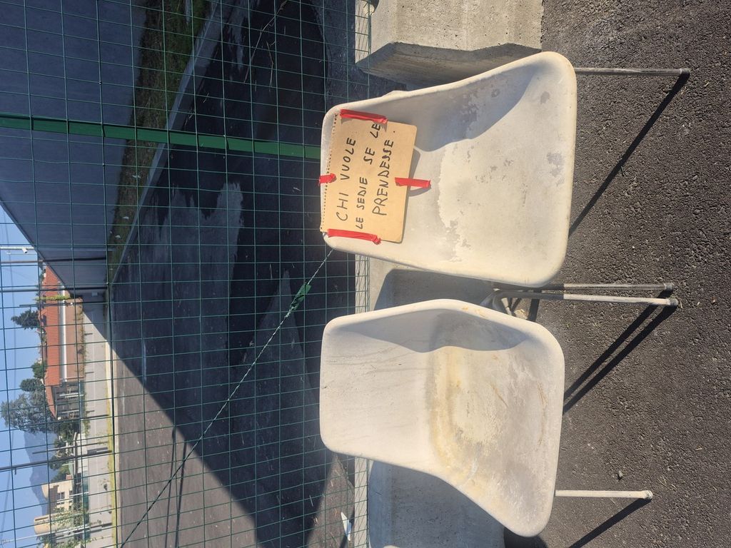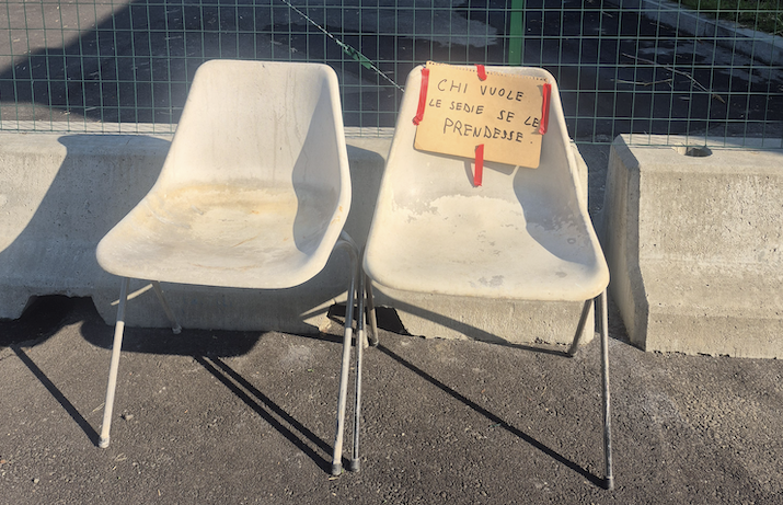 Da dove spuntano le sedie? Un rimasuglio del cantiere secolare del nuovo piazzale? Il frutto di un repulisti casalingo di Ferragosto? Di certo hanno preso acqua per un bel po’, come dimostrano le tracce di calcare sul sedile, ma in fondo con un po’ di pazienza si potrebbero anche rimettere in sesto, qualora «chi vuole se le prendesse.»