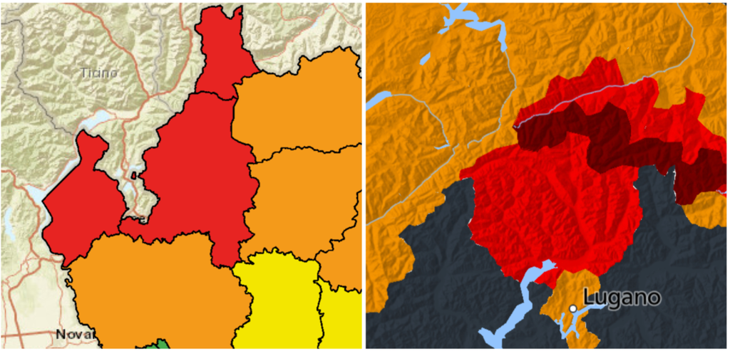 Anche Meteo Svizzera ha messo in allerta per le attese piogge forti e anche per il rischio di piena ed esondazioni per i fiumi Maggia, Ticino e per il Lago di Lugano: pericolo marcato (arancione, livello 3) per il sud del Ticino, Luganese e Mendrisiotto, e pericolo forte (rosso, livello 4) per il Sopraceneri da oggi alle 15 fino alla mezzanotte di venerdì. Il pericolo di piena entra in vigore da domani, giovedì 28 agosto.