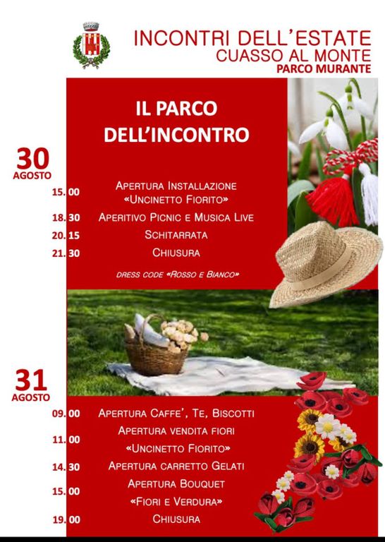 Il Parco dell’Incontro è l’appellativo che prenderà il parco Murante di Cuasso al Monte, dove sabato 30 agosto, nel pomeriggio, verrà aperta l’installazione Uncinetto fiorito. A seguire ci sarà un pic-nic aperitivo accompagnato dalla musica live delle chitarre. Dress code per l’occasione i colori bianco-rosso.