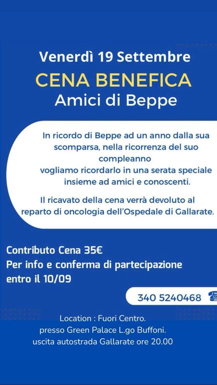 Se ne andava a 63 anni martedì 3 settembre 2024 Giuseppe De Bernardi Martignoni, un uomo che intendeva la politica, ma anche e soprattutto la vita, come passione e sacrificio. Noi lo ricordiamo così. Lo faranno venerdì 19 settembre nel giorno in cui avrebbe compiuto gli anni anche gli "amici di Beppe" attraverso una cena benefica alle ore 20 al "Fuori Centro" presso il Green Palace di largo Buffoni all'uscita dell'autostrada di Gallarate: il ricavato della serata verrà devoluto al reparto di oncologia dell'ospedale di Circolo di Varese (contributo di 35 euro, per info e conferma 340 5240468).