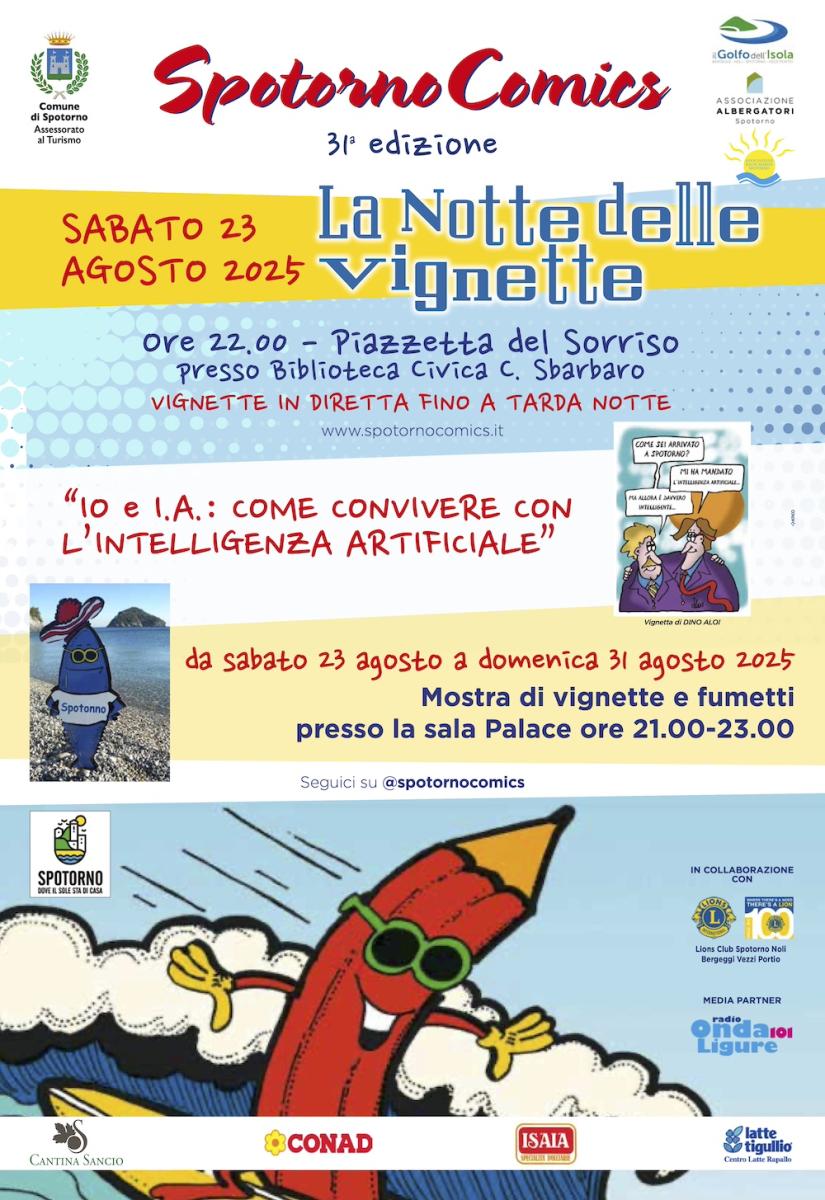 “La Notte delle Vignette ha un ‘nonsoché’ di magia che ci incanta, ci trattiene e ci emoziona” - ha commentato l’assessora al Turismo Cristiana Sechi - “Le matite, i pennarelli colorati, i pennelli che si muovono sul foglio bianco fanno una sorta di incantesimo che blocca, rapisce, che fa dimenticare il quotidiano, fa volare verso mondi lontani nelle mani capaci dell'artista scelto. Tutto questo è Spotorno Comics, un abbandono dei pensieri per un volo di fantasia. I temi sono sempre diversi. Negli anni ne sono stati proposti di tutti i generi” – ha detto ancora l’assessora - “con una particolare attenzione agli eventi del momento. Quest'anno non poteva mancare l'Intelligenza Artificiale, un nuovo mondo, a molti ancora sconosciuto, capace di migliorare o peggiorare le cose a seconda del suo utilizzo. A Spotorno Comics, tutto quello che potremmo fare, dire, scrivere e disegnare sul tema dell' IA, sarà creato utilizzando sempre e comunque lo strumento più importante, la nostra fantasia.”