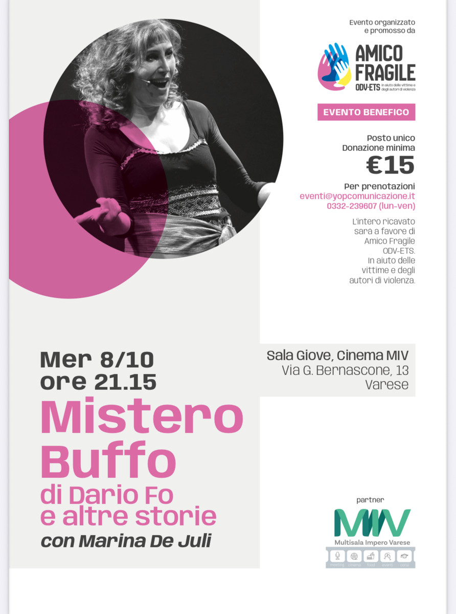 Dopo il successo dello spettacolo teatrale con Marina De Juli in occasione della Giornata Internazionale della Donna, l’8 marzo scorso, l’associazione Amico Fragile OdV-ETS propone un nuovo appuntamento: Mistero Buffo, tratto dall’opera di Dario Fo, in scena martedì 8 ottobre alle ore 21.15 presso il Cinema MIV, in via Bernascone 13 a Varese.