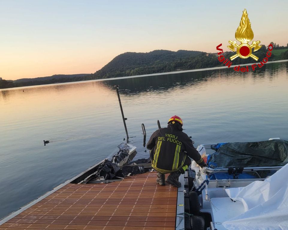Incendio di un pontile a Travedona, vigili del fuoco in azione