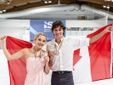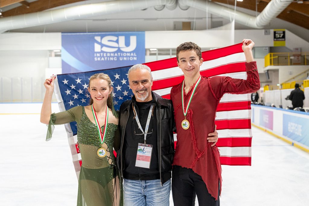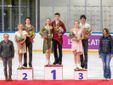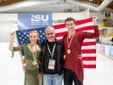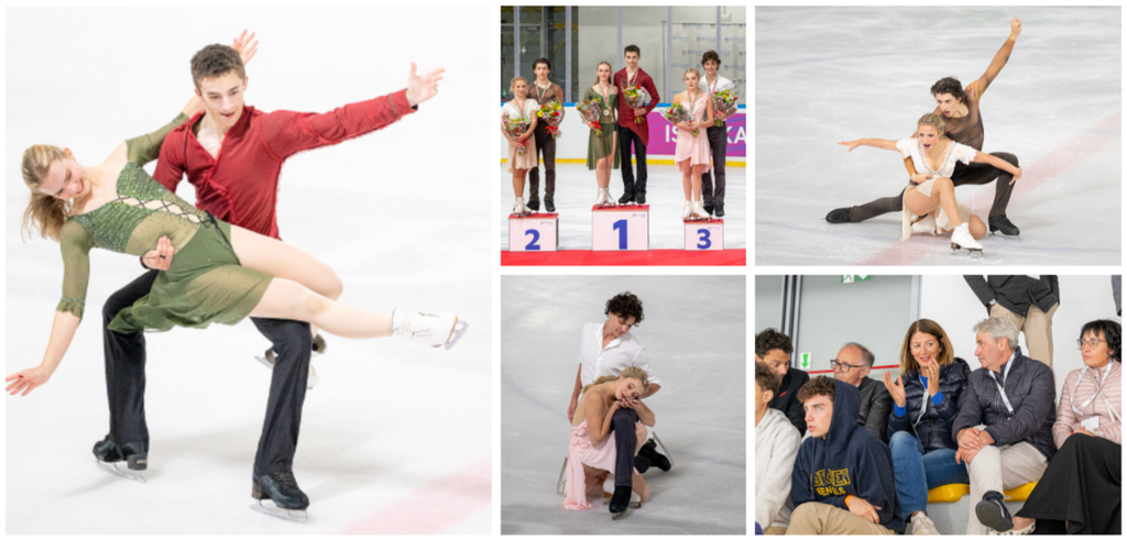 A destra la coppia Usa d'oro nella danza, qui sopra in senso orario il podio, i francesi d'argento, il sindaco Davide Galimberti e il vicesindaco Ivana Perusin in tribuna e i canadesi di bronzo