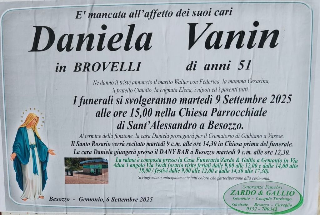 La comunità di Besozzo è in lutto per la prematura scomparsa, avvenuta all'età di 51 anni a causa di una grave malattia, di Daniela Vanin, conosciuta da tutti come “la Dany”, storica proprietaria del Bar Dany di Besozzo superiore.