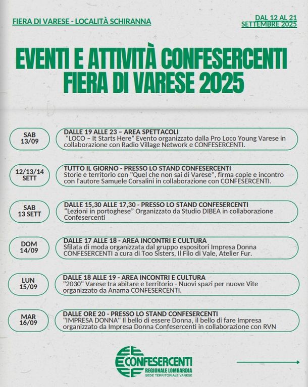In occasione della Fiera di Varese 2025, Confesercenti si conferma parte attiva con un calendario ricco di appuntamenti, pensati per valorizzare l’imprenditorialità, promuovere la cultura locale e stimolare il dialogo tra cittadini, istituzioni e imprese.