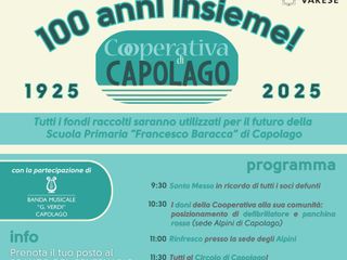 Il Pranzo del Centenario, accessibile a prezzi simbolici, riunirà chiunque vorrà partecipare in un momento conviviale, e i fondi raccolti saranno destinati per il futuro della Scuola Primaria “Francesco Baracca” di Capolago. Nel pomeriggio, sempre al Circolo di Capolago, ci sarà uno spettacolo teatrale dal titolo “Capolago e la sua storia”, un viaggio teatrale tra volti, voci e vicende che hanno plasmato l’identità del paese.