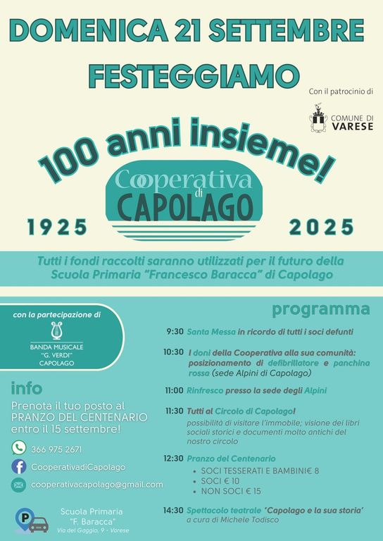 Domenica 21 settembre il cuore di Capolago festeggia cent’anni della sua storia. L'evento, patrocinato dal Comune di Varese, unirà memoria, solidarietà e cultura in una giornata indimenticabile.