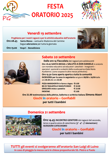 L’Oratorio San Luigi di Luino si prepara a vivere tre giornate di festa, preghiera e condivisione, con tutta la Comunità Pastorale “Madonna del Carmine”, in occasione della tradizionale Festa dell’Oratorio 2025, in programma da venerdì 19 a domenica 21 settembre. Il programma si aprirà venerdì 19 settembre con una giornata in cui l’intera comunità è invitata a pregare per i ragazzi e le attività educative dell’oratorio.