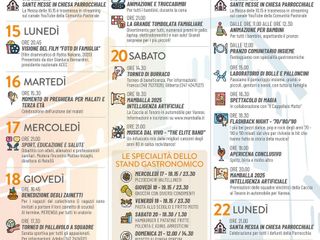 Per chi prima dell’evento vorrà cenare all’oratorio sarà attivo il banco gastronomico (in basso il menù proposto per tutti i giorni di festa, da mercoledì a domenica), che per il giorno di "Sport, Educazione, Salute" propone: