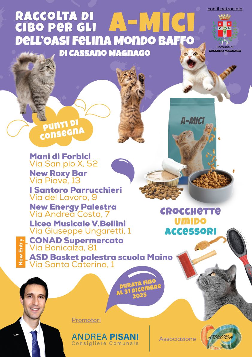 Con il rientro dalle ferie e la ripresa delle attività lavorative e scolastiche i cassanesi potranno portare, fino al 31 dicembre 2025, le loro donazioni costituite da confezioni di alimenti (crocchette, umido, scatolette) ed accessori (come coperte, traversine) anche in altri due punti che si sono aggiunti ai precedenti, nello specifico presso il supermercato Conad in via Bonicalza che ha allestito un angolo con un carrello della spesa dedicato e all’Asd Basket Cassano Magnago, nella palestra della scuola Maino, durante gli orari d’allenamento delle squadre, da lunedì a venerdì dalle ore 16.00 alle ore 23.00 e il sabato dalle ore 15.00 alle ore 19.00.