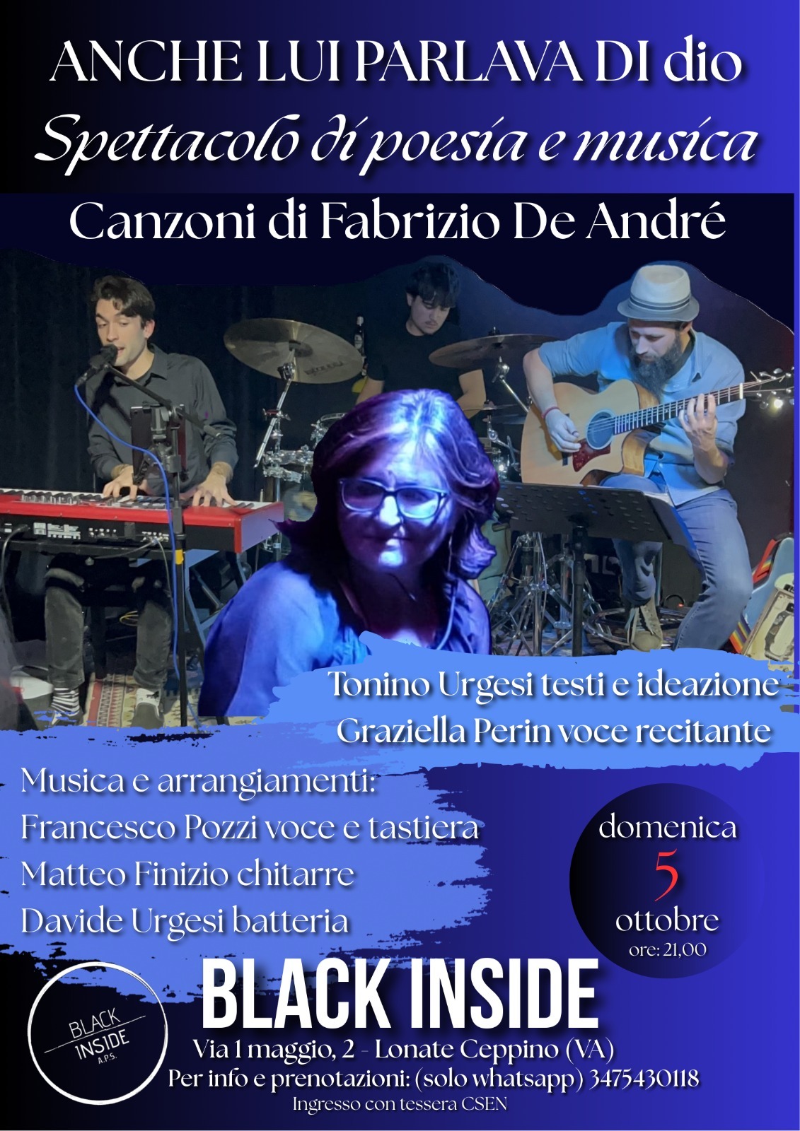 Una riflessione sulla drammatica situazione politica e sociale attuale, guidata da una originale lettura e selezione delle canzoni di Fabrizio De André: domenica 5 ottobre, alle 21.00, al circolo “Black Inside” di via 1 maggio 2 a Lonate Ceppino, andrà in scena “Anche lui parlava di Dio”. Testi e ideazione sono a cura di Tonino Urgesi, che ha curato la scelta dei brani individuando, nell’intera discografia dell’indimenticabile Faber, 10 sulle circa 80 canzoni che riportano la parola “dio”.