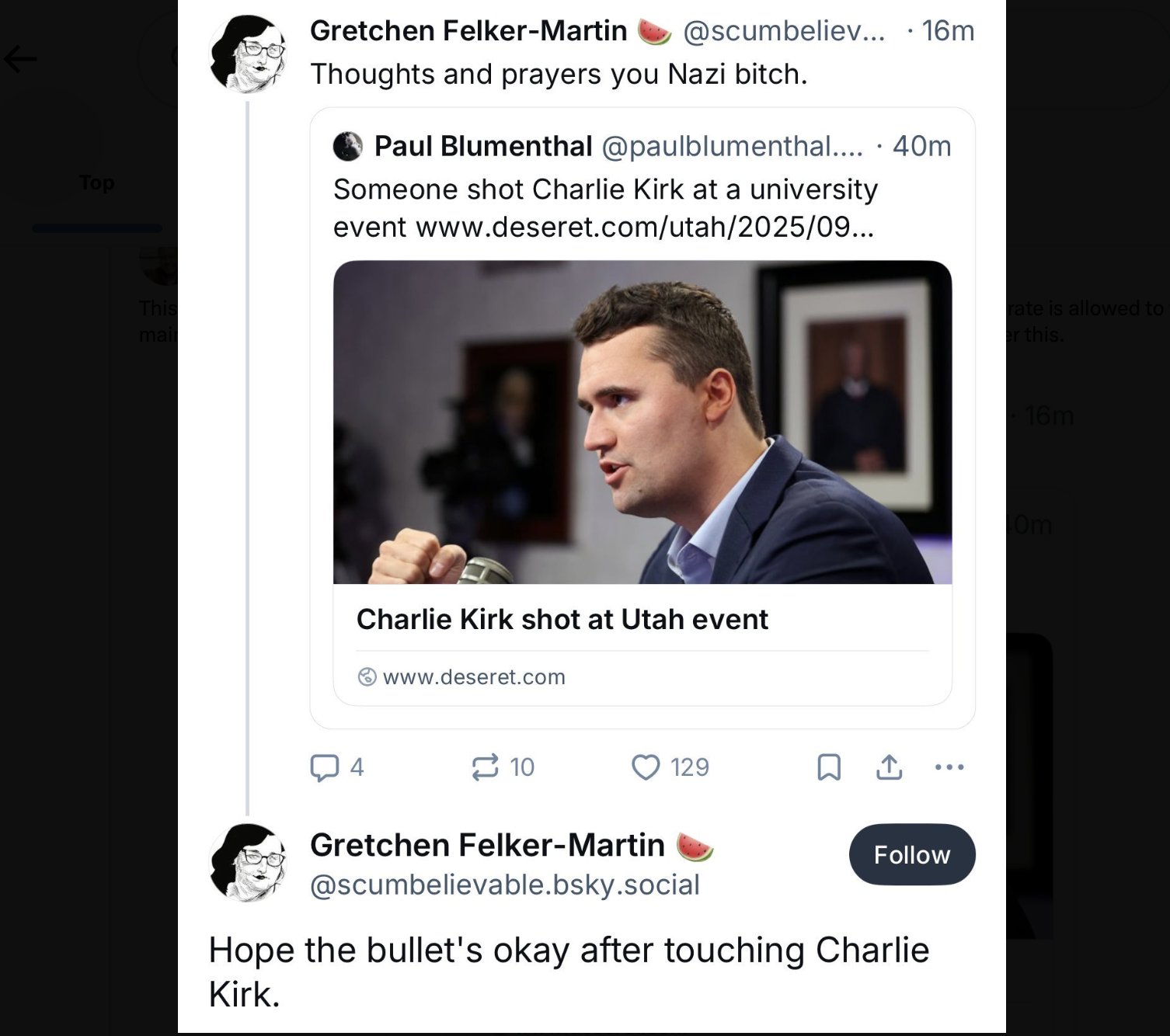 Nell’ultima frase Gretchen Felker-Martin fa riferimento al suo essere trans e alla propaganda, bisogna ammetterlo, piuttosto violenta, che Kirk ha sempre ostentato nei confronti di chiunque non fosse etero.