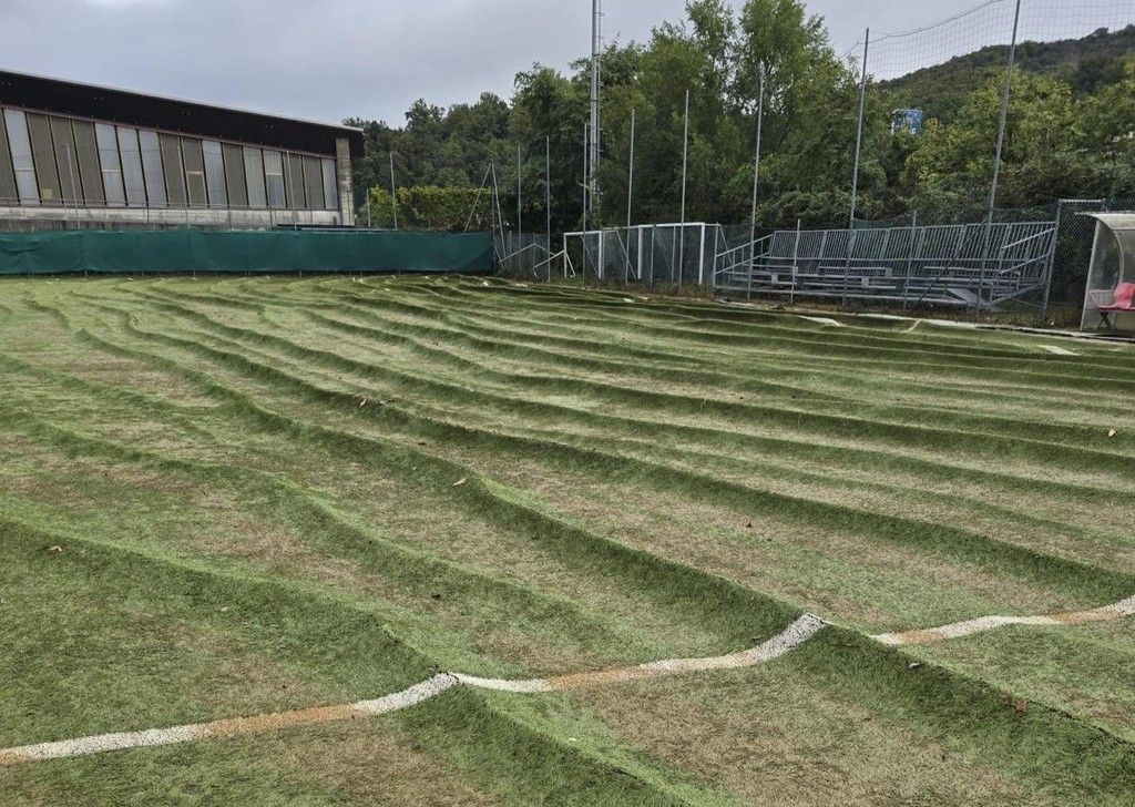 Quel che resta del campo in sintetico dove giocava la Cairese dopo l'alluvione a Cairo Montenotte (Savona) in Val Bormida