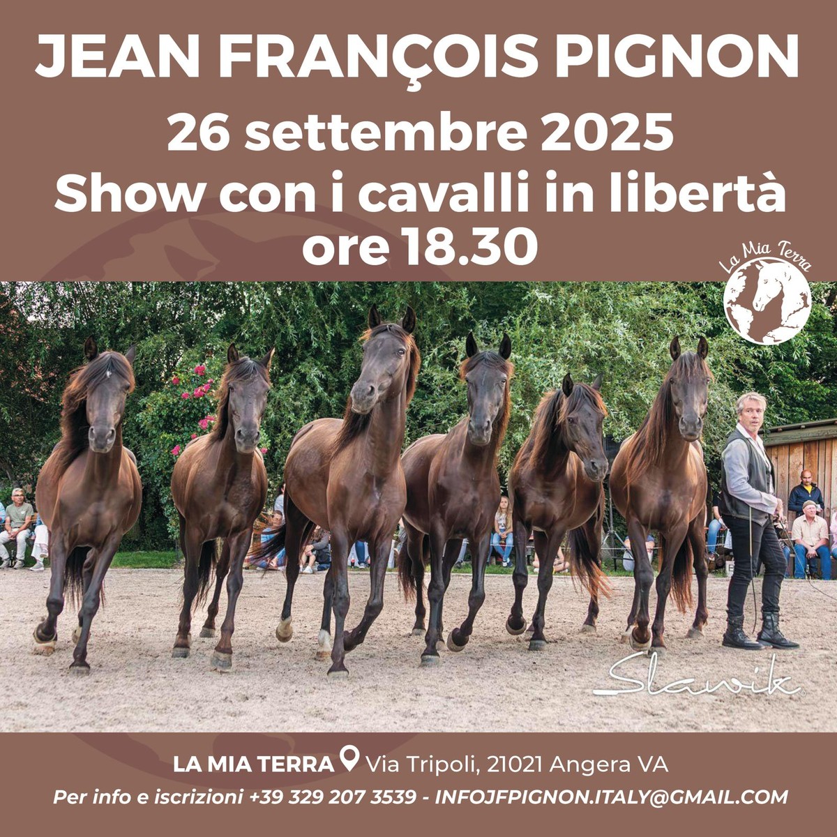 Jean François Pignon è uno dei più grandi uomini di cavalli al mondo. Dotato di sensibilità estrema è un insuperabile artista della comunicazione con i cavalli. Pignon crea un ponte silenzioso tra l’uomo e la natura portando in scena uno spettacolo magico ed emozionante, una vera e propria danza con sedici cavalli in libertà dimostrando ciò che è veramente importante: il legame d’amore che li unisce. Pignon porta i suoi spettacoli nel mondo ed è un privilegio averlo in Italia, in Lombardia ad Angera, dove porterà il suo spettacolo venerdì 26 settembre. Un evento unico, da non perdere sia per gli amanti dei cavalli, degli animali, sia per tutti coloro che desiderano vivere emozioni uniche.