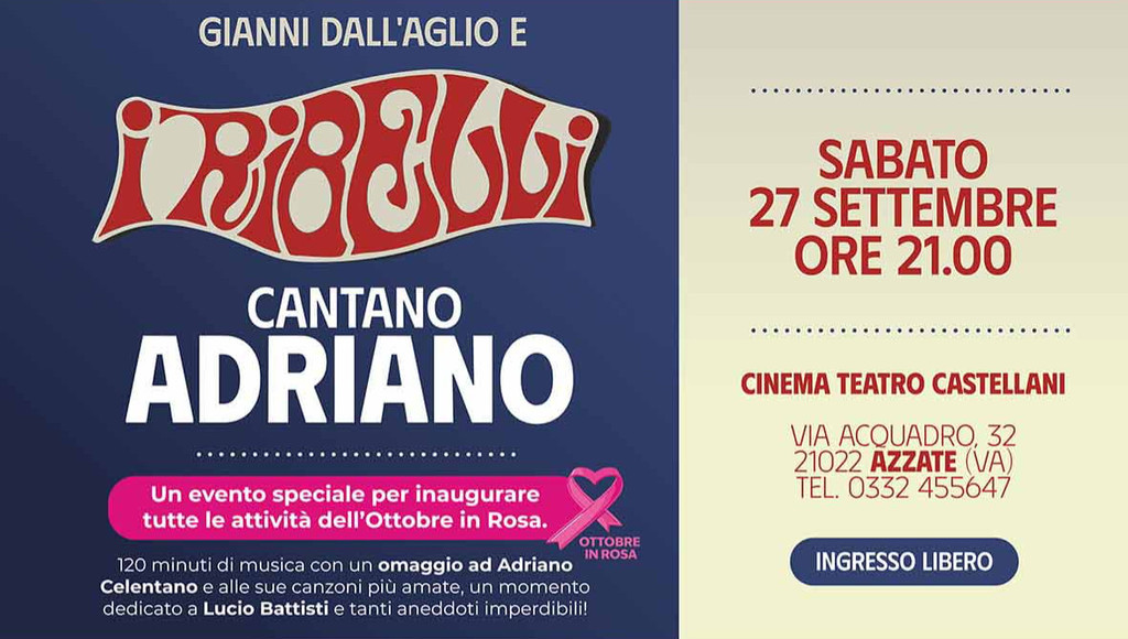 Un concerto per sensibilizzare le persone sulla prevenzione oncologica inaugura ufficialmente Ottobre in Rosa, il mese dedicato alla prevenzione oncologica promosso dalla Bcc di Busto Garolfo e Buguggiate e dal suo braccio operativo Ccr Insieme Ets. Sabato 27 settembre alle 21, al Cinema Teatro Castellani di Azzate, Gianni Dall’Aglio e i Ribelli accenderanno il palco con due ore di musica e ricordi, in un viaggio che celebra Adriano Celentano, Lucio Battisti e un’epoca indimenticabile della storia musicale italiana. L’iniziativa è inserita nel calendario di Valbossa in Rosa, progetto che unisce istituzioni, associazioni e territorio nel segno della sensibilizzazione.