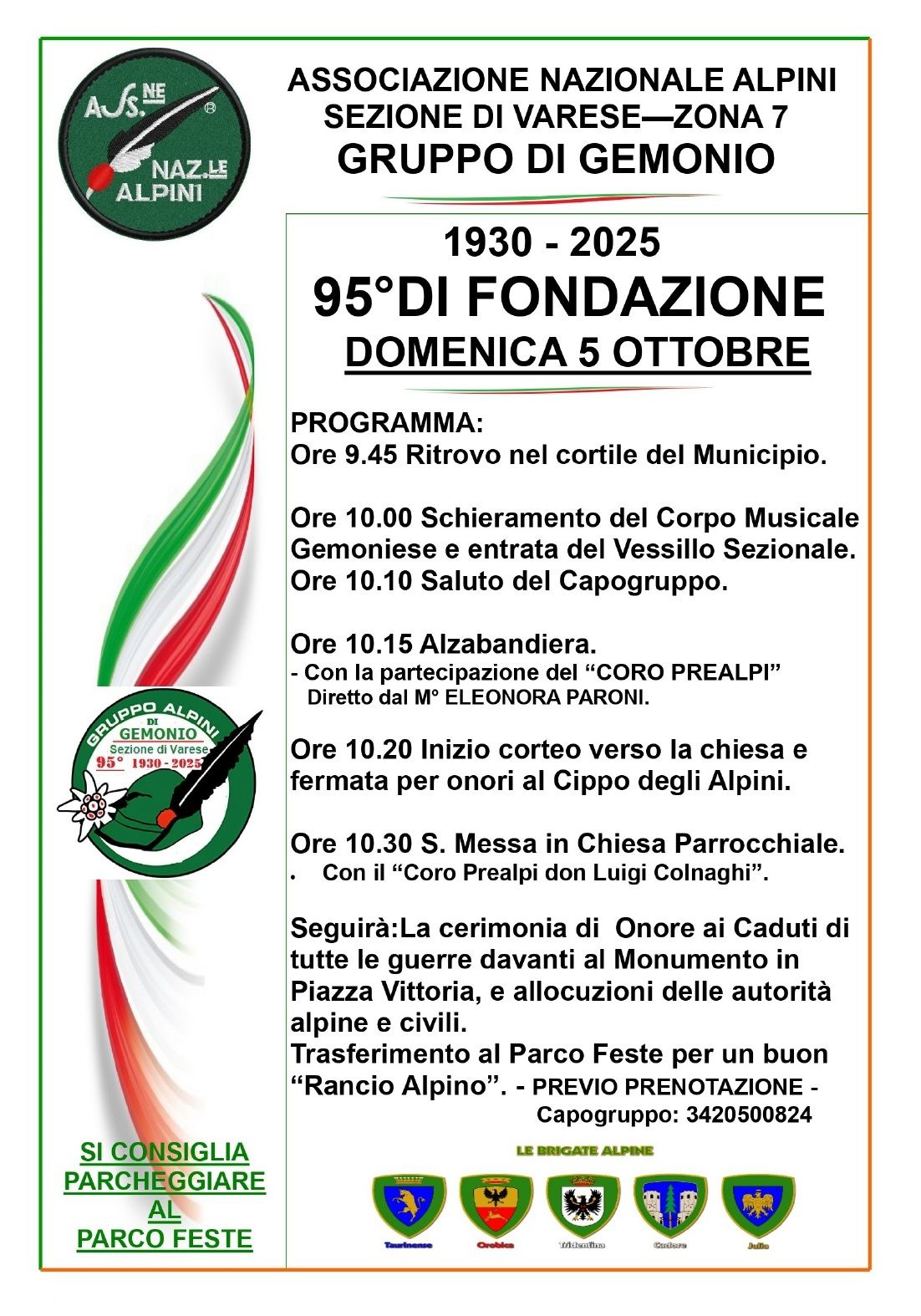 Domenica 5 ottobre Gemonio festeggia il 95° anniversario di fondazione del Gruppo Alpini con una giornata ricca di momenti solenni e di comunità. Il programma prenderà il via alle 9.45 con il ritrovo nel cortile del Municipio, seguito dallo schieramento del Corpo Musicale Gemoniese e dall’entrata del Vessillo Sezionale. Dopo il saluto del capogruppo e l’alzabandiera, accompagnati dal “Coro Prealpi” diretto dal maestro Eleonora Paroni, alle 10.20 partirà il corteo verso la Chiesa Parrocchiale con sosta al Cippo degli Alpini. La Santa Messa, animata dal “Coro Prealpi don Luigi Colnaghi”, sarà celebrata alle 10.30. A seguire, in Piazza Vittoria, la cerimonia di onore ai Caduti di tutte le guerre e gli interventi delle autorità alpine e civili. La giornata proseguirà al Parco delle Feste con il tradizionale “Rancio Alpino”, prenotabile al numero 3420500824.