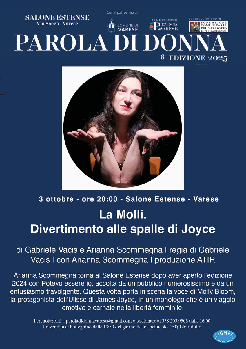 Dopo il successo della serata inaugurale con Amanda Sandrelli, la rassegna Parola di Donna 2025 prosegue venerdì 3 ottobre ALLE ORE 20 al Salone Estense di Varese con uno dei monologhi più intensi del teatro italiano: “La Molli. Divertimento alle spalle di Joyce”, di Gabriele Vacis e Arianna Scommegna, con la regia di Gabriele Vacis e l’interpretazione di Arianna Scommegna.