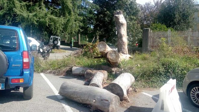 Come segnalato in precedenza, i resti del pino, a febbraio, erano ancora lì e la situazione, a oggi, non è cambiata. Il tronco e i rami giacciono ancora nello stesso posto occupando due posti auto e impedendo, così, di parcheggiare.