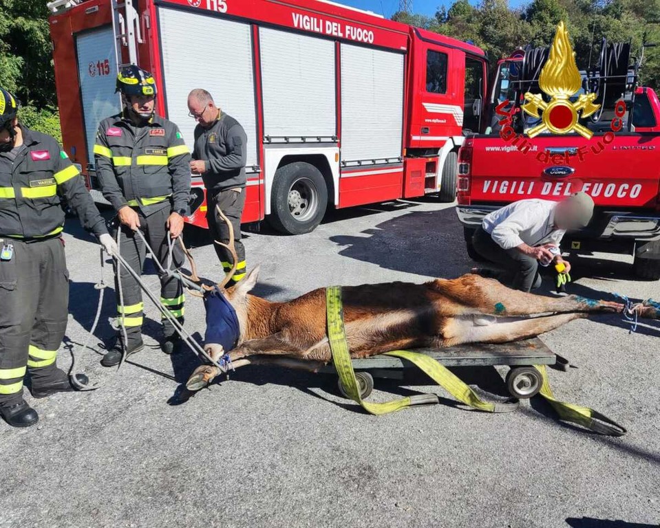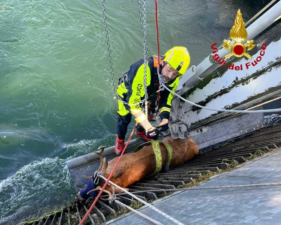 FOTO. Cervo finisce nel canale. Lo salvano i vigili del fuoco