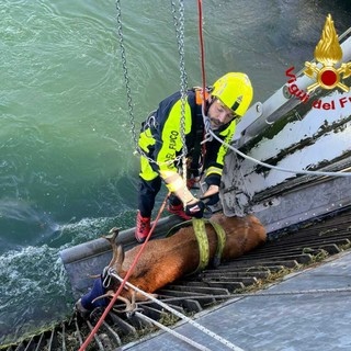 FOTO. Cervo finisce nel canale. Lo salvano i vigili del fuoco