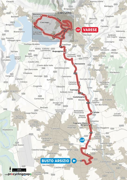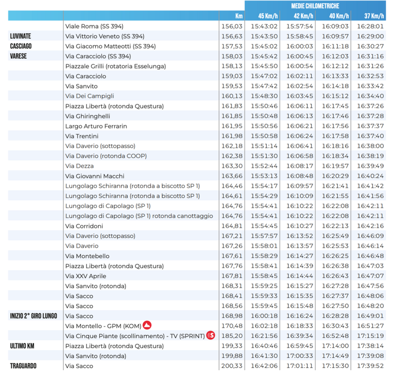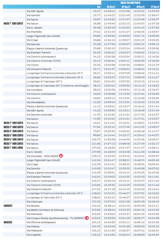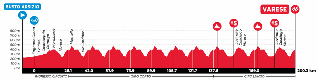 Qui sotto trovate anche la planimetria e l'altimetria del tracciato e dei circuiti finali che decidono la corsa, un percorso di 200,3 chilometri che ricalca quello dell’edizione scorsa, non disputata per il maltempo con novità importante nel finale. Partenza da Busto Arsizio alle 11.55 con trasferimento a Solbiate Olona, dove ci sarà il via ufficiale (alle 12.15), e da lì passaggio da Fagnano Olona, Cairate, Carnago, Azzate e ingresso nel Comune di Varese. Dopo il primo passaggio sui Ronchi (1,9 chilometri al 5,3% di pendenza media), transito sul traguardo di via Sacco e, da lì, via ai sette giri "corti", con salite del Montello e, appunto, dei Ronchi.