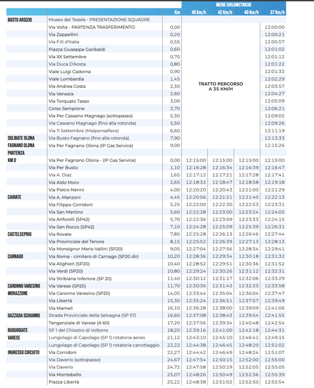 Sotto in allegato i pettorali degli iscritti, gara per gara, e nella gallery le tabelle orarie con i passaggi paese per paese, Qui le strade chiuse.