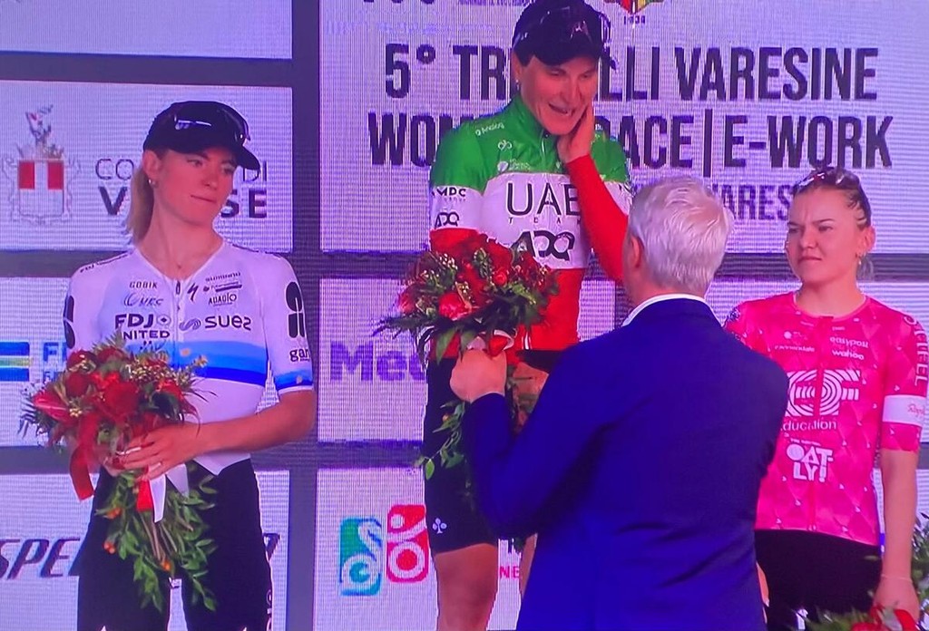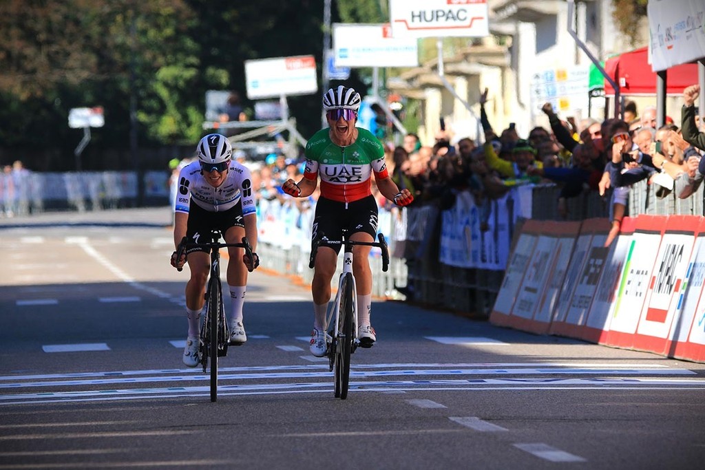 La campionessa italiana dell’UAE Team ADQ batte allo sprint a due la campionessa europea Demi Vollering della FDJ-Suez al termine di una gara in cui la trentatreenne verbanese ha attaccato diverse volte.