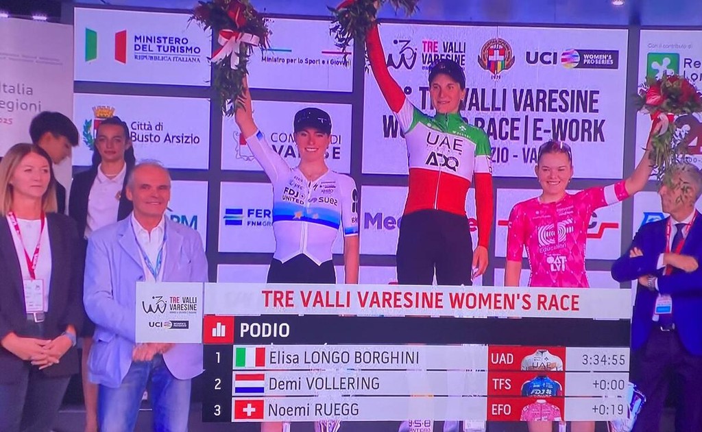 Terza classificata, a 19 secondi, la svizzera Noemi Ruegg della EF Education-Oatly. Solo decima, a 24 secondi, la campionessa del mondo Magdeleine Vallieres, che aveva provato a tenere il passo delle due migliori, salvo arrendersi sull’ultima ascesa dei Ronchi.