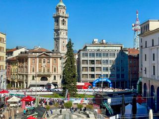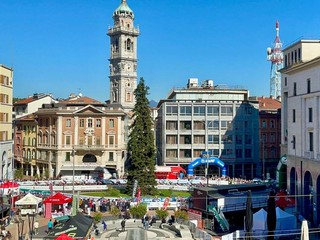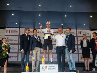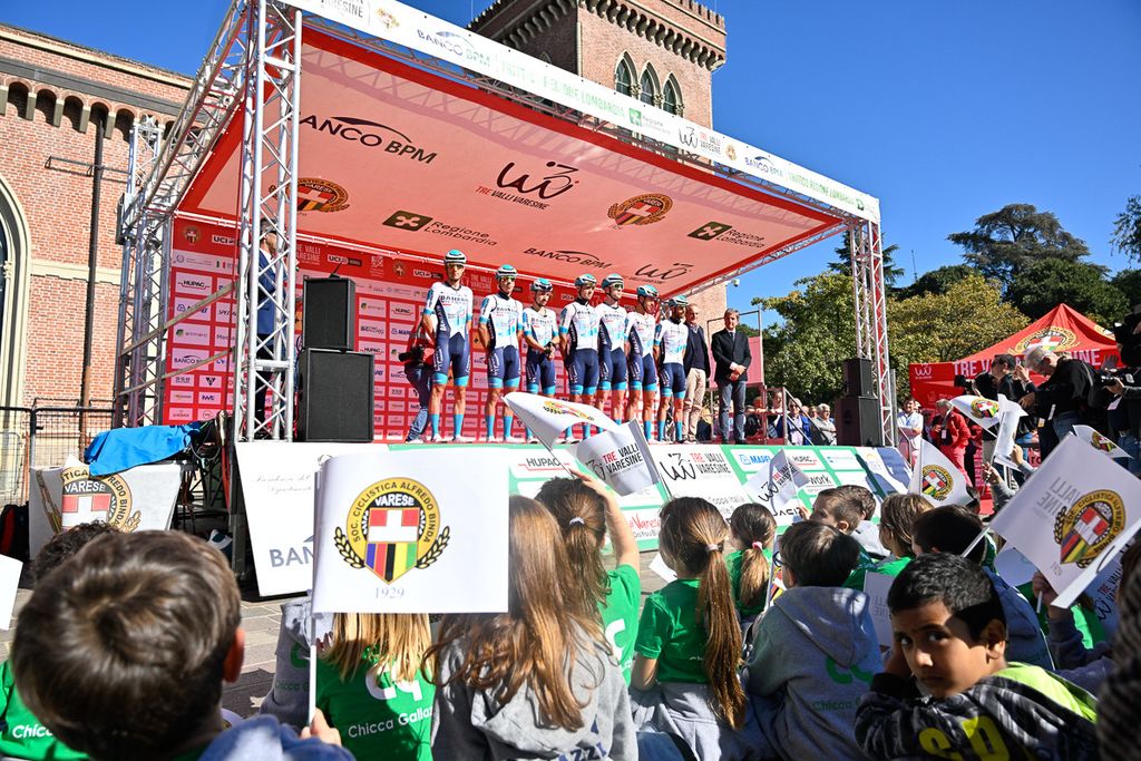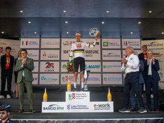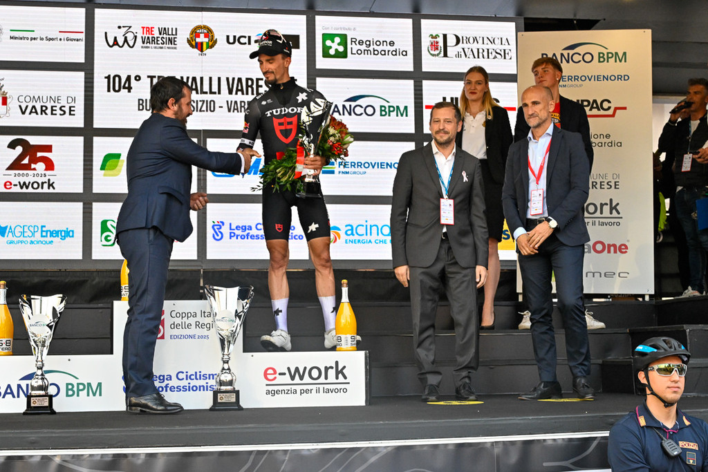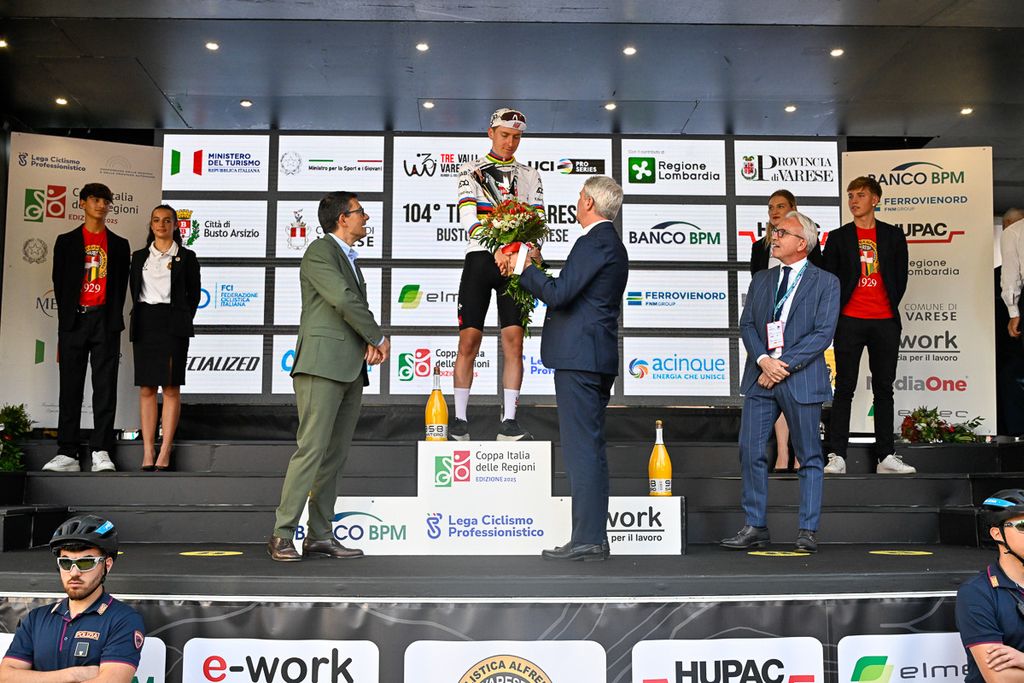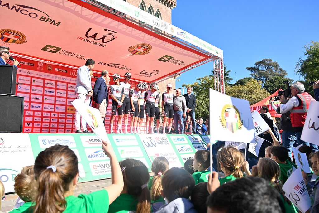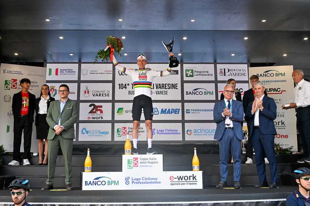 17.01 Premiazioni in piazza Monte Grappa: Tadej Pogacar sale sul gradino più alto del podio, in migliaia applaudono il re di Varese e del mondo