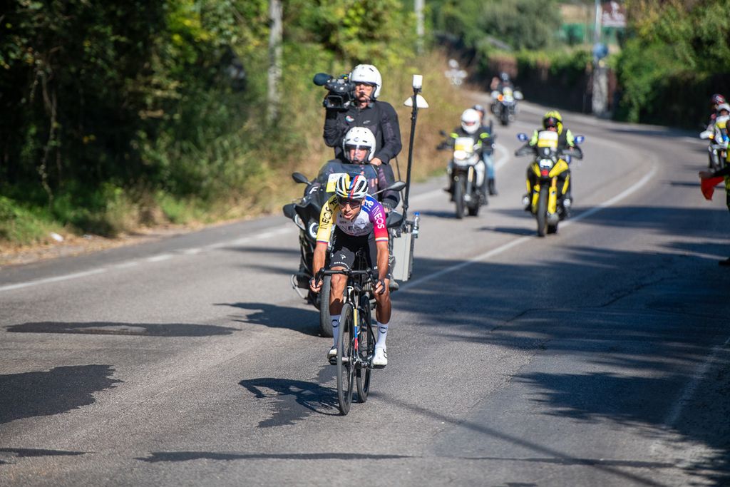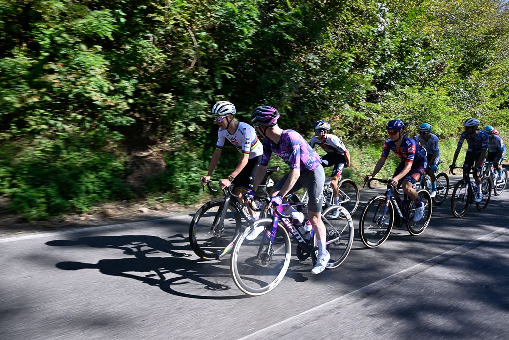 15.51 Scatto deciso di Quinn Simmons (Lidl-Trek) sul finale della salita. L'americano raggiunge Milesi. In testa al gruppo ancora l'UAE Emirates.