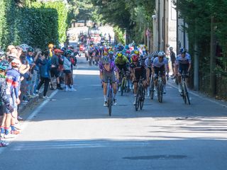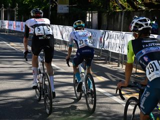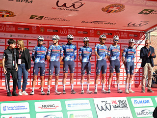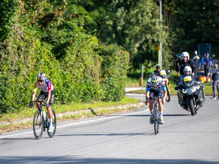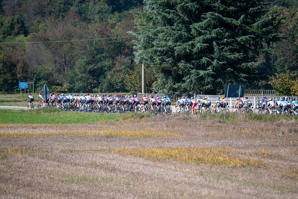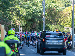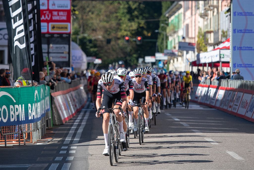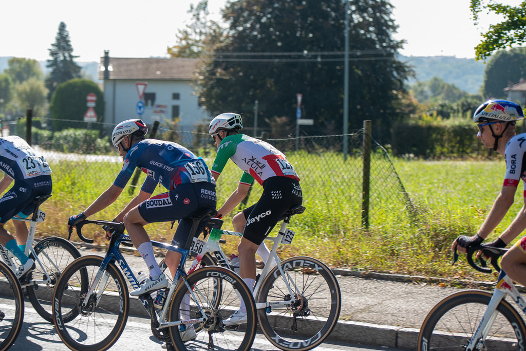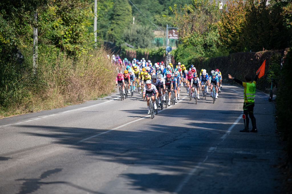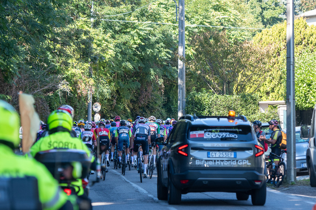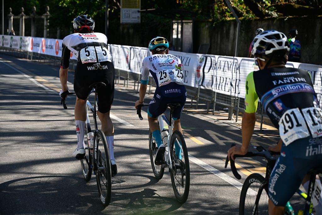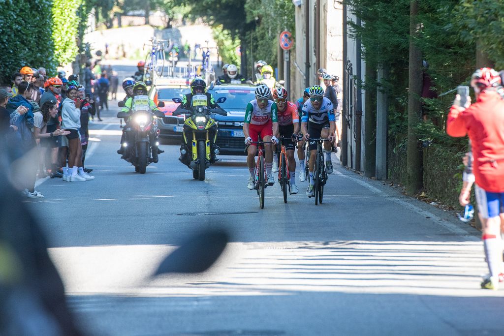 16.19 Il gruppo, in ritardo una ventina di secondi, è tirato dalla Q36.5 Pro Cycling Team e dalla EF Education. Pogacar prova ad allungare nella discesa che porta alla Schiranna, e e continua la sua progressione sulla strada del lungolago di Calcinate. 20 chilometri all'arrivo.