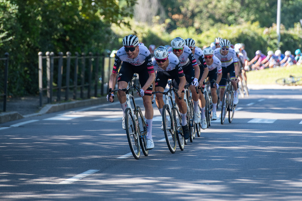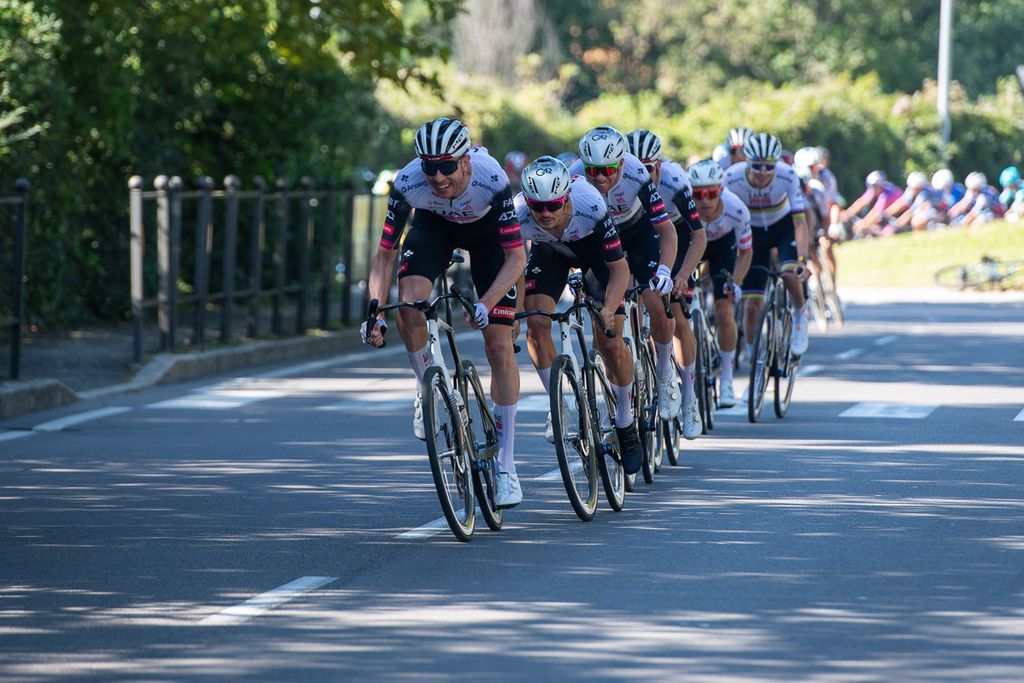 15.25 Nuovo passaggio sul traguardo di via Sacco: iniziano ora i due giri lunghi. Circa 62 chilometri all'arrivo. Bernal e Milesi con 45 secondi su Brambilla e Storer e 1:15 sul gruppo, tirati dagli uomini di Pogacar.
