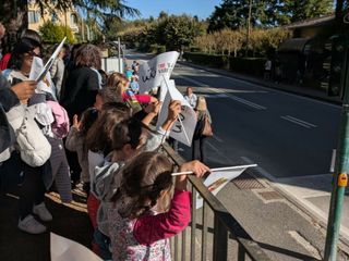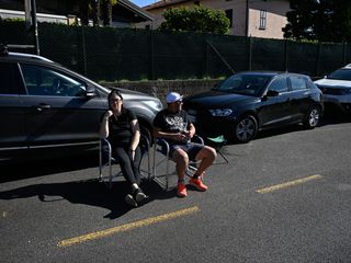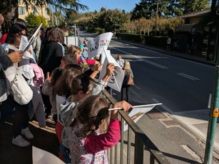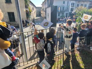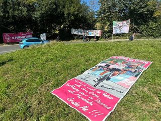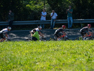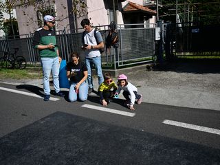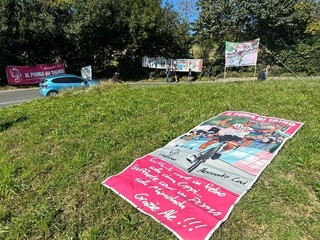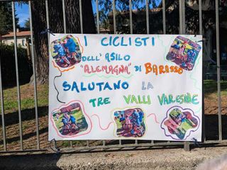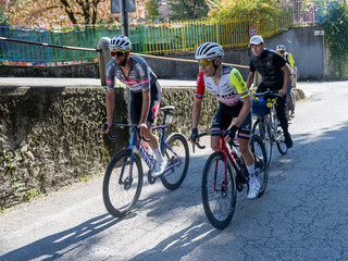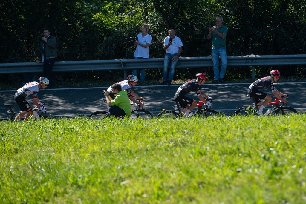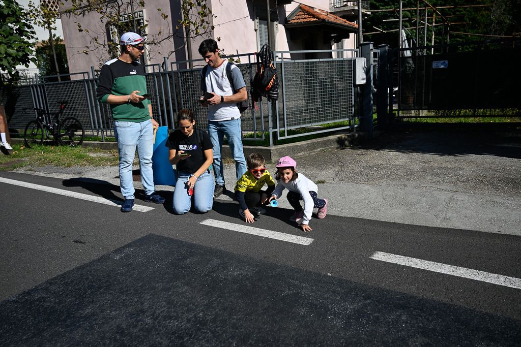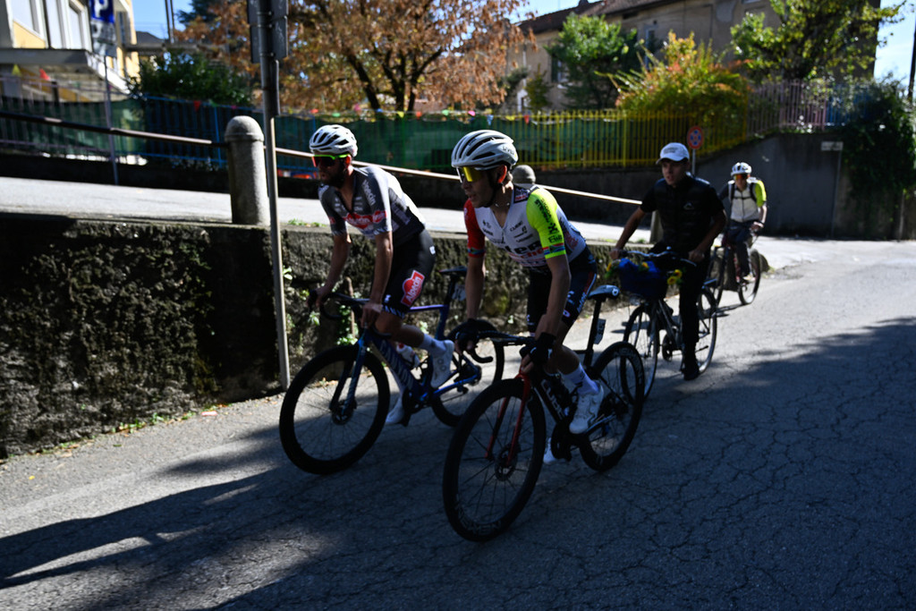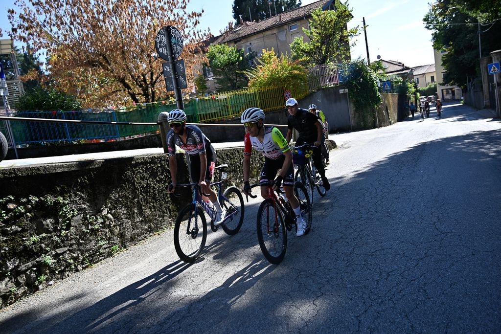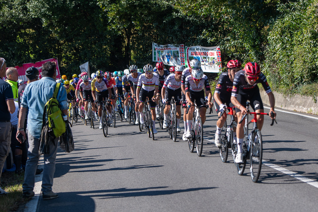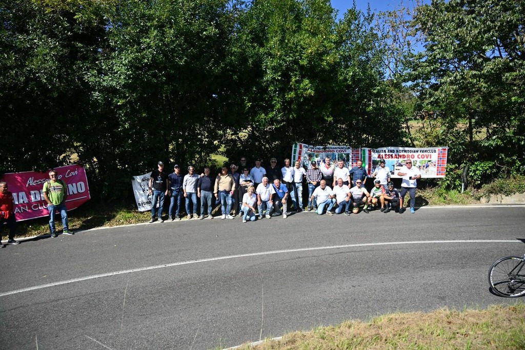 14.08 Le prime foto dalla gara arrivano dalla salita dei Ronchi, dove un nutrito gruppo di sostenitori di Alessandro Covi si è ritrovato a tifare per il puma di Taino.