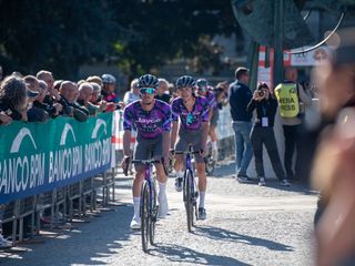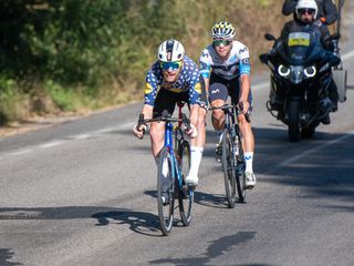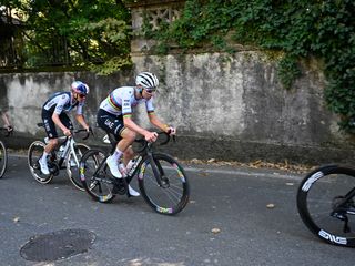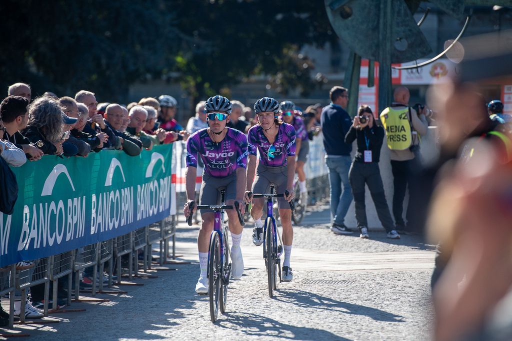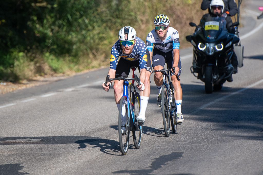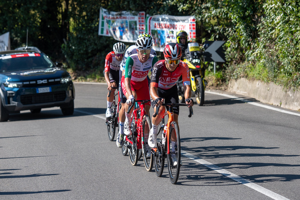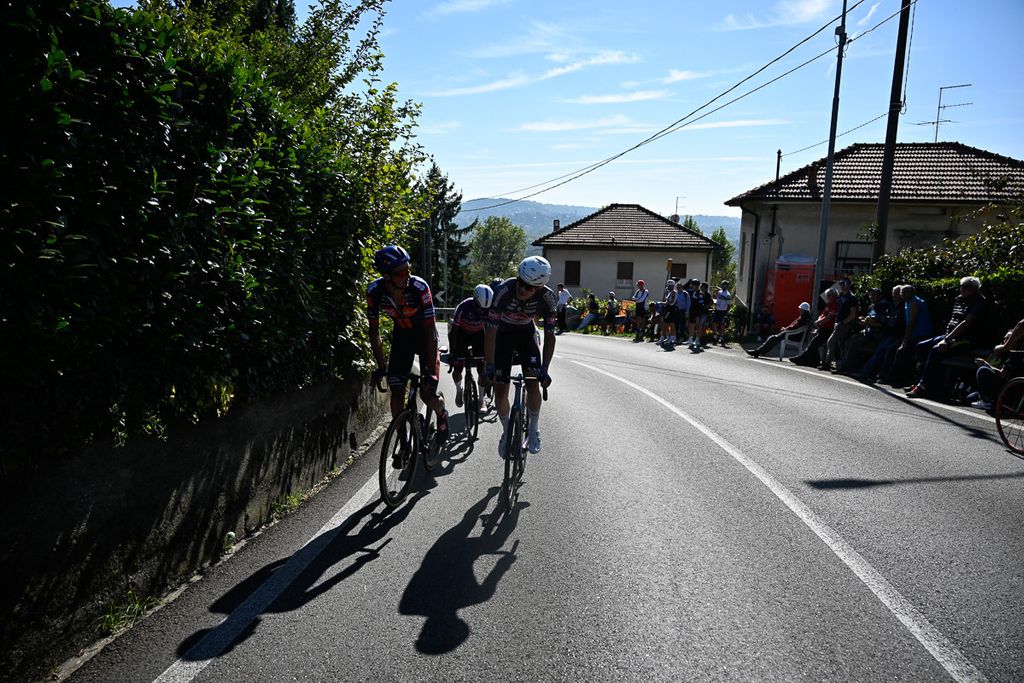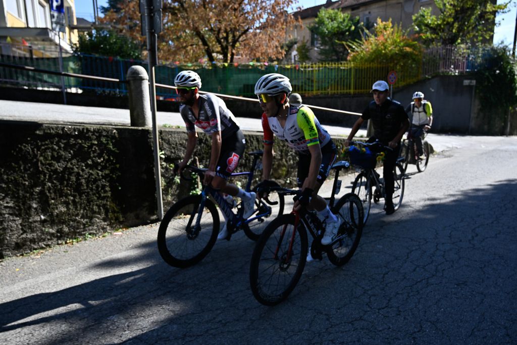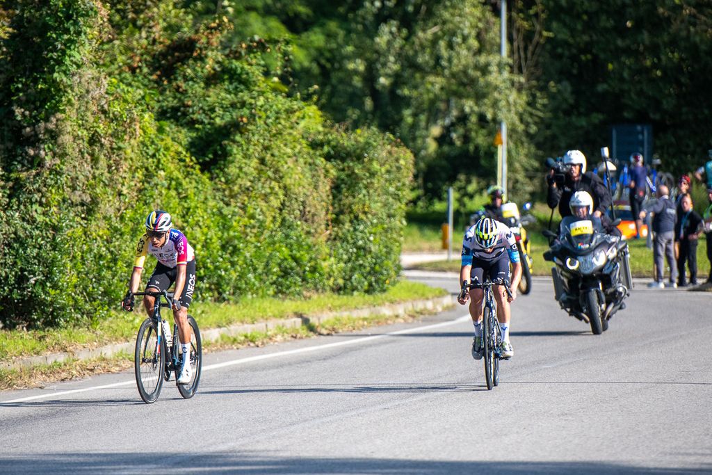 15.23 Sulla salita dei Ronchi si muovono dal gruppo Gianluca Brambilla (Q36.5 Pro Cycling Team) e Michael Storer (Tudor-Pro Cycling Team).