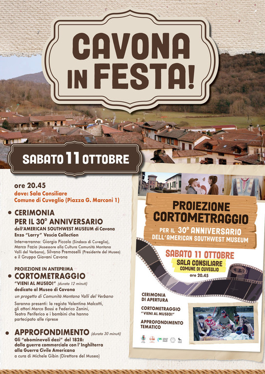 Il fine settimana si apre sabato 11 ottobre alle ore 20.45 presso la Sala Consiliare del comune di Cuveglio (piazza G. Marconi, 1) con la Cerimonia ufficiale per il 30° anniversario dell’American Southwest Museum. Alla serata interverranno il Sindaco Giorgio Piccolo, l’Assessore alla Cultura della Comunità Montana Valli del Verbano Marco Fazio, il Presidente del Museo Silvano Premoselli e il Gruppo Giovani Cavona.