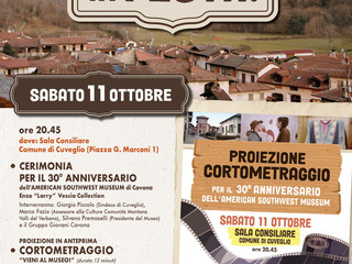 Il fine settimana si apre sabato 11 ottobre alle ore 20.45 presso la Sala Consiliare del comune di Cuveglio (piazza G. Marconi, 1) con la Cerimonia ufficiale per il 30° anniversario dell’American Southwest Museum. Alla serata interverranno il Sindaco Giorgio Piccolo, l’Assessore alla Cultura della Comunità Montana Valli del Verbano Marco Fazio, il Presidente del Museo Silvano Premoselli e il Gruppo Giovani Cavona.