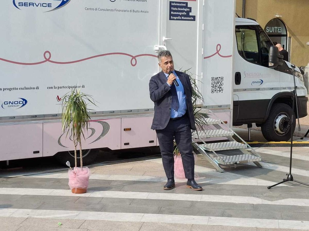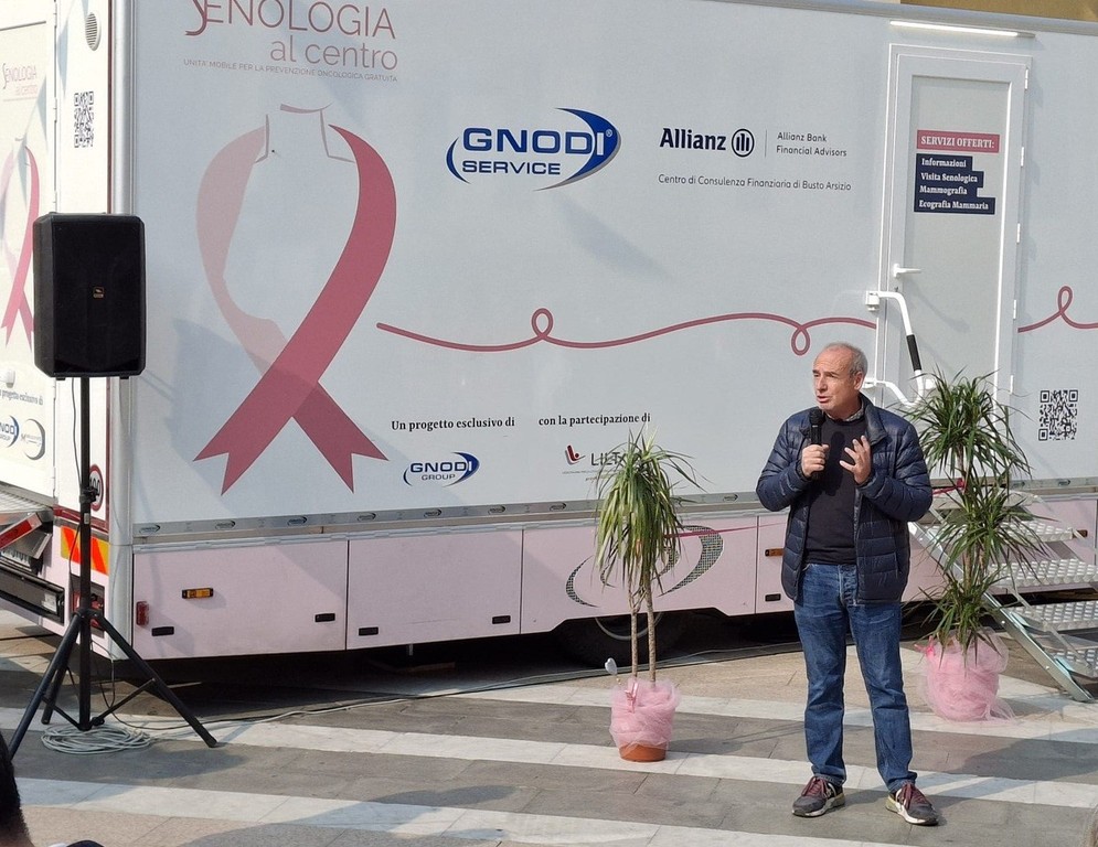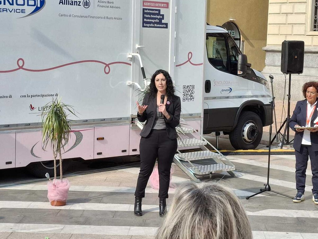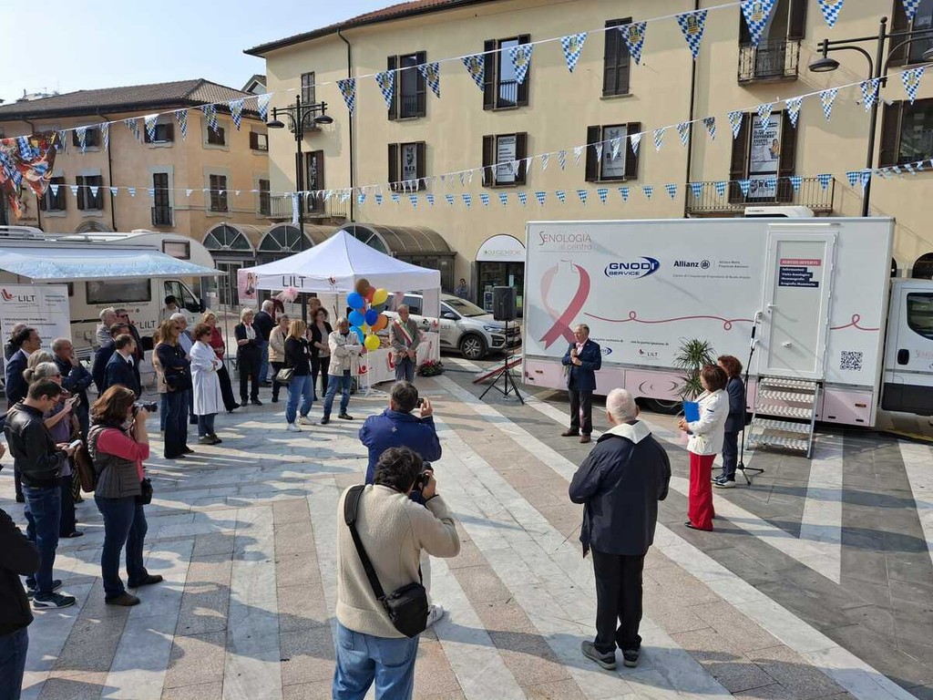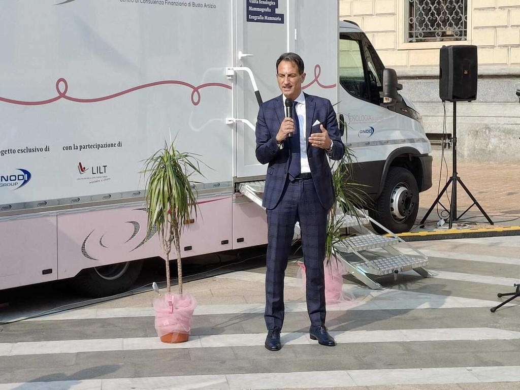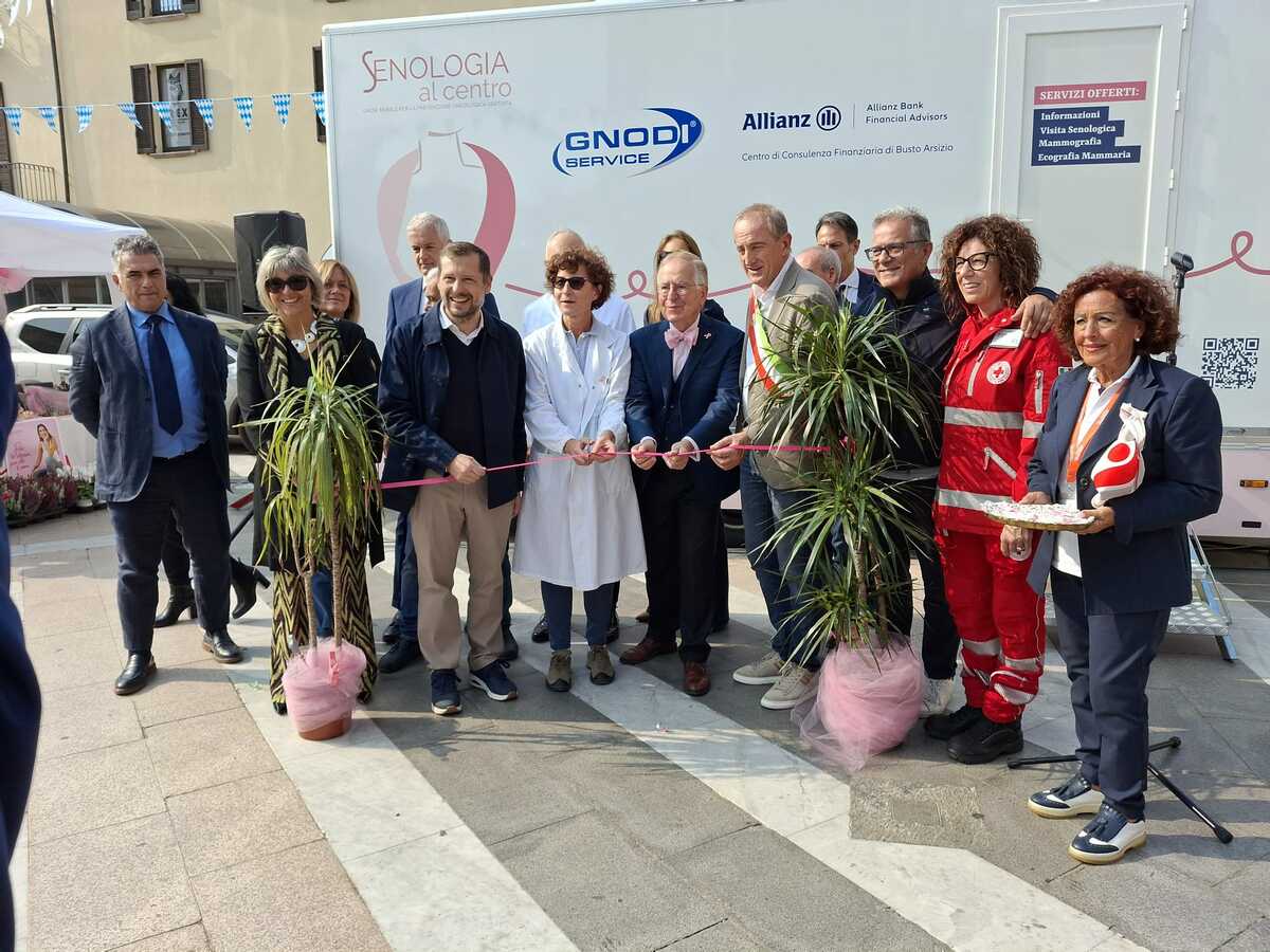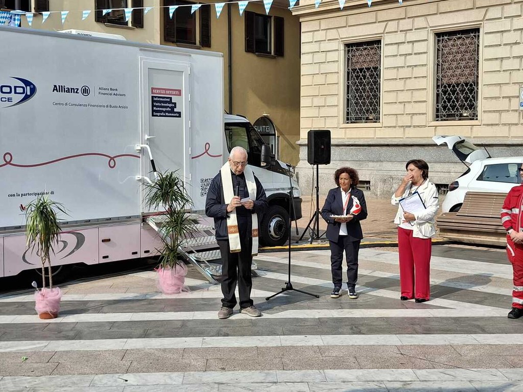 Il dato positivo è che ancora una volta gli slot per visite gratuite in piazza San Giovanni sono stati prenotati un attimo: la clinica mobile messa a disposizione dal Gruppo Gnodi (con mammografo di ultima generazione ed ecografo) fa registrare un nuovo tutto esaurito. “Senologia al centro” (iniziativa che da quattro anni occupa pacificamente il cuore di Busto nel pieno dell’Ottobre Rosa dedicato alla prevenzione) è sempre appuntamento atteso, apprezzato, sfruttato. Il dato negativo lo ha ricordato, poco prima del taglio del nastro odierno, Giuseppe Catanoso, direttore sanitario di Ats Insubria: «Le campagne di screening normalmente registrano basse percentuali di adesione». La sfida, citata a più riprese e quasi coralmente nella breve cerimonia, è semplice: diffondere i controlli, anche andando nelle periferie (accanto alla clinica mobile ha trovato posto in piazza un camper donato a Lilt che ha proprio questo scopo). Anche perché, ha ammonito Ivanoe Pellerin, presidente di Lilt – Associazione provinciale di Varese, «…i tumori colpiscono sempre di più le giovani. Al contempo, va detto che un’azione efficace sugli stili di vita farebbe calare del 30 per cento i casi di tumore, questa è la stima, e che la diagnosi precoce può condurre alla guarigione».