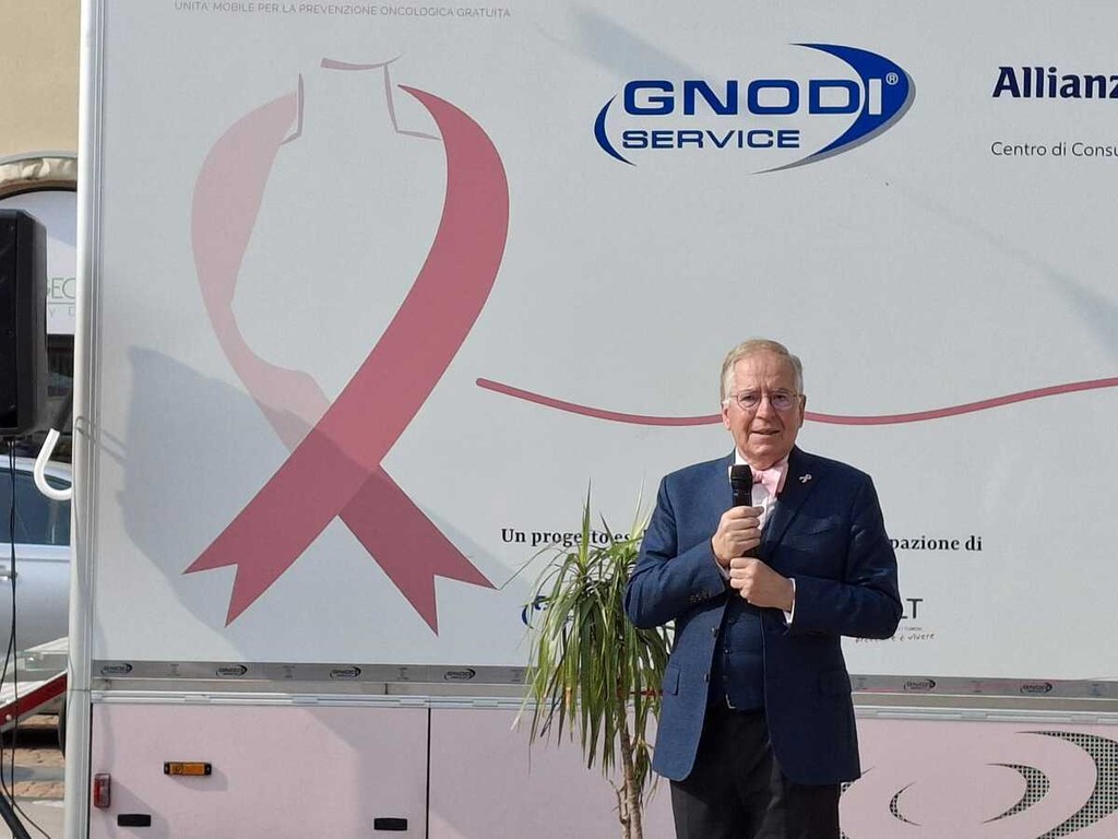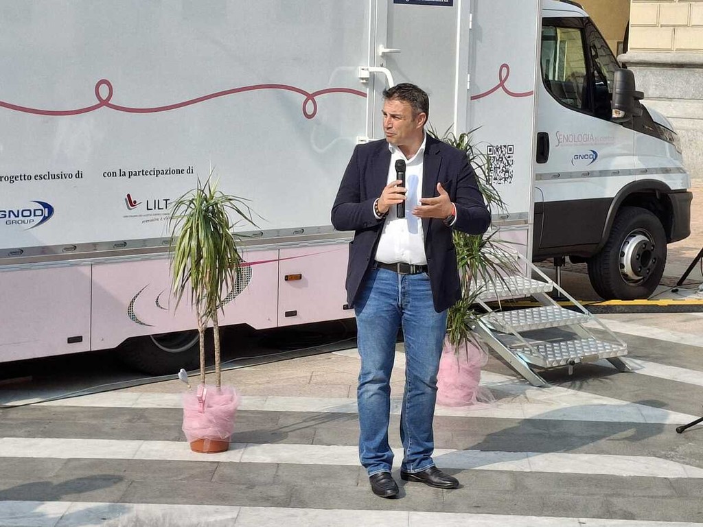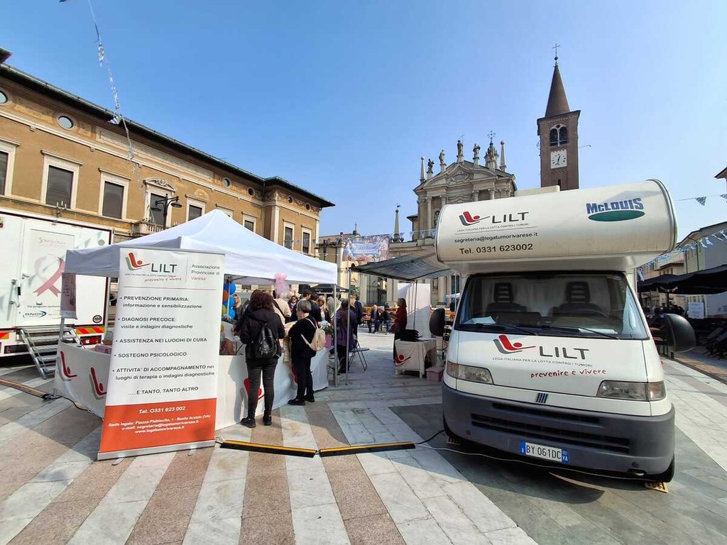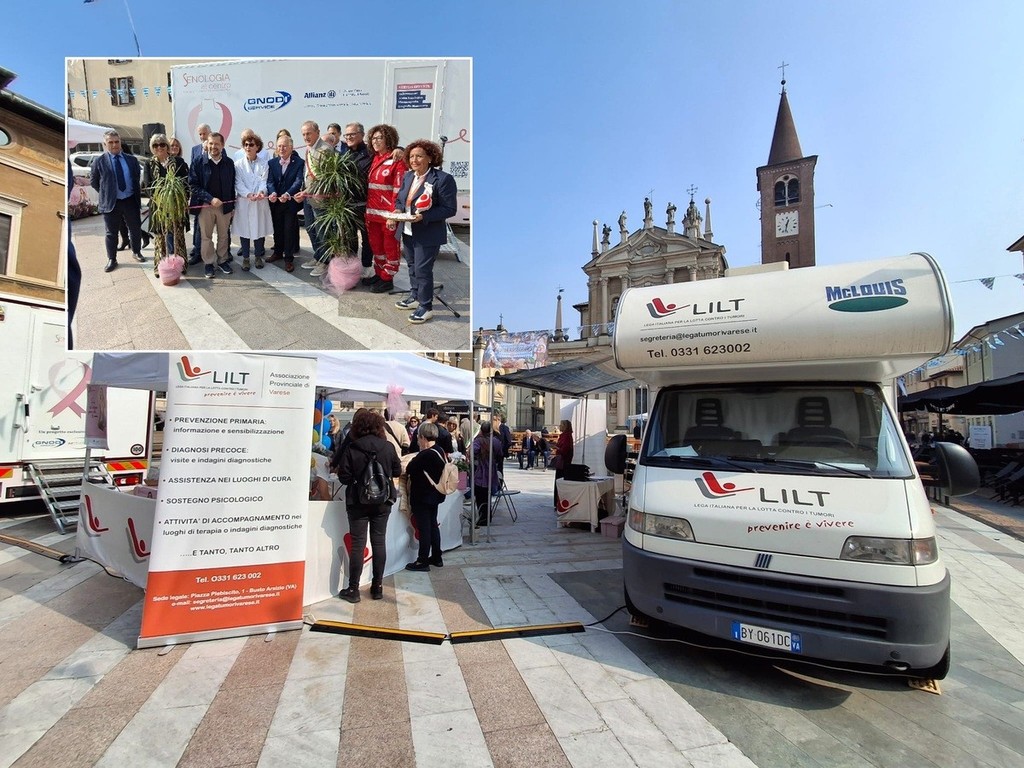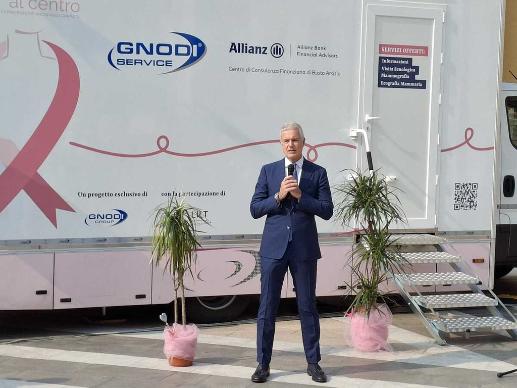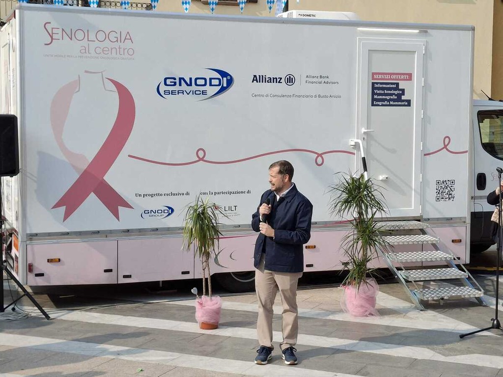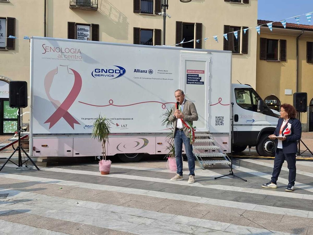 Il dato positivo è che ancora una volta gli slot per visite gratuite in piazza San Giovanni sono stati prenotati un attimo: la clinica mobile messa a disposizione dal Gruppo Gnodi (con mammografo di ultima generazione ed ecografo) fa registrare un nuovo tutto esaurito. “Senologia al centro” (iniziativa che da quattro anni occupa pacificamente il cuore di Busto nel pieno dell’Ottobre Rosa dedicato alla prevenzione) è sempre appuntamento atteso, apprezzato, sfruttato. Il dato negativo lo ha ricordato, poco prima del taglio del nastro odierno, Giuseppe Catanoso, direttore sanitario di Ats Insubria: «Le campagne di screening normalmente registrano basse percentuali di adesione». La sfida, citata a più riprese e quasi coralmente nella breve cerimonia, è semplice: diffondere i controlli, anche andando nelle periferie (accanto alla clinica mobile ha trovato posto in piazza un camper donato a Lilt che ha proprio questo scopo). Anche perché, ha ammonito Ivanoe Pellerin, presidente di Lilt – Associazione provinciale di Varese, «…i tumori colpiscono sempre di più le giovani. Al contempo, va detto che un’azione efficace sugli stili di vita farebbe calare del 30 per cento i casi di tumore, questa è la stima, e che la diagnosi precoce può condurre alla guarigione».