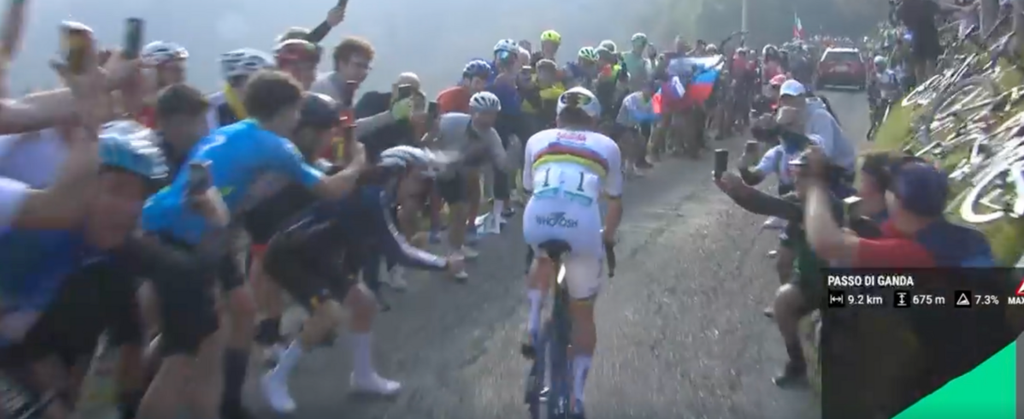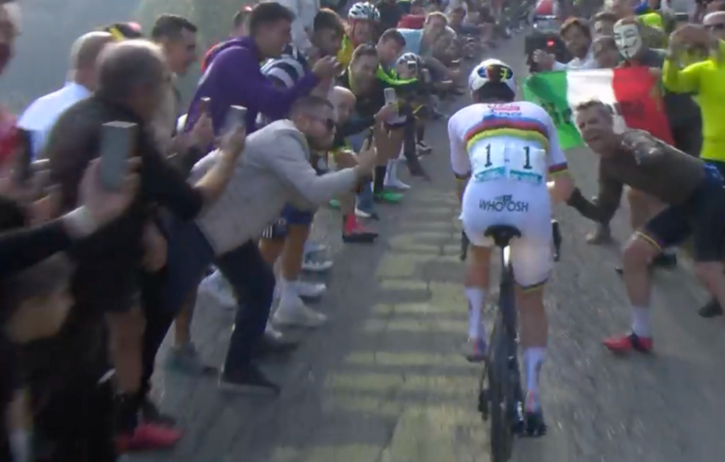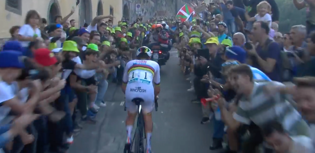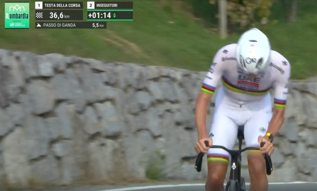 Un uomo solo al comando, la sua maglia è iridata, il suo nome è Tadej Pogacar. Adesso sì che possiamo dirlo senza vergogna né pudore: Fausto Coppi non se ne avrà a male.