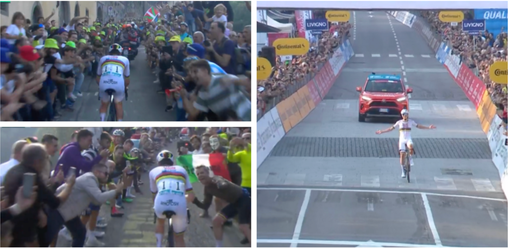 L'aveva annunciato e, ancora una volta, l'ha fatto davvero (proprio questa è la sua forza: tutti se l'aspettano, e lui arriva puntualissimo, secco e impossibile da respingere come un fulmine). Tadej è partito in progressione a 36,5 chilometri dal traguardo di Bergamo, quasi a metà salita del Passo di Ganda, quando lì davanti erano rimasti in sei, ma di questi tre erano della UAE Team Emirates XRG (Tadey, Jay Vine e uno strabordante Del Toro, che ha maciullato quel che rimaneva del gruppo, tra cui Remco Evenepoel). Nei primi 4 chilometri di attacco il re rifila 54 secondi a Simmons, 1'14" al gruppetto Evenepoel e 2'28" al gruppo Roglic. Alla fine piomberà sul traguardo di Bergamo, fendendo ali di folla, davanti - molto avanti - a Evenepoel, staccato di 1'48", e a Michael Storer, finito a 3'14".