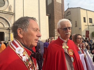 Momento indimenticabile appunto la sfilata in centro raggiungendo quel gioiello che è il santuario di Santa Maria. Foto di gruppo davanti alla chiesa, poi la messa celebrata dal prevosto Severino Pagani. Anche se il santuario è una gioia per gli occhi e per la storia dell'arte, vederlo ulteriormente colorato dai mantelli dei partecipanti si è rivelato alquanto emozionante. Non facile contenere tutti i 280 ospiti, alcuni sono rimasti ad esplorare la città. Anche a godersi un caffè nei bar della piazza o a scoprire la cantina settecentesca della pasticceria Oscar.