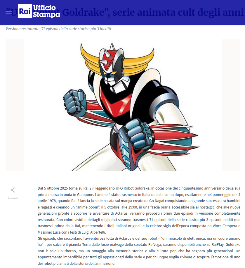 Il comunicato stampa della Rai che ha annunciato la messa in onda della serie di Goldrake del ‘78