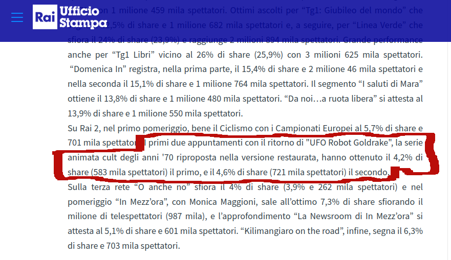 I dati Auditel di Goldrake nel comunicato stampa della Rai