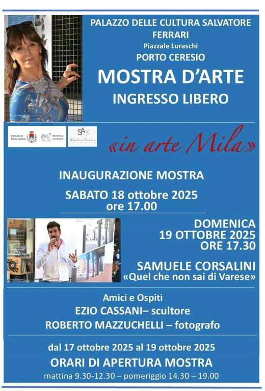 A Porto Ceresio, il weekend di iniziative culturali continuerà anche sabato e domenica: il 18 ottobre verrà inaugurata, alle 17, la mostra In arte Mila, sempre presso il Palazzo della Cultura in piazzale Luraschi. L’esposizione verrà aperta il giorno precedente, il 17 ottobre e rimarrà disponibile fino alle 19 di domenica 19 ottobre.